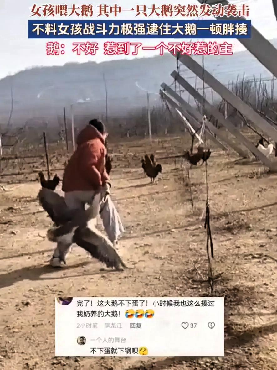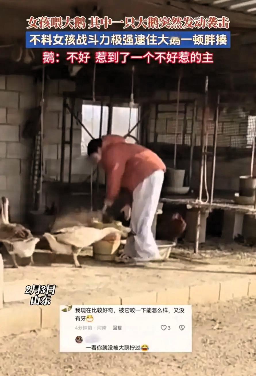 山东,一大学生放假回家,帮家里喂大鹅时,一只大鹅突然对女生发动袭击,面对嚣张的大鹅,她没有慌乱躲避,反而淡定出手将其制伏,这份遇事不慌的从容,着实让人佩服。 女生提着饲料到鹅圈投喂,刚把饲料撒进食槽,一只体型壮硕的大鹅就突然扑过来,伸长脖子猛啄她的小腿,猝不及防下女生被啄得一个趔趄,裤腿也被啄出了几道印子。换作一般人,大概率会被吓得赶紧躲开,可这位姑娘却很快稳住了身形,没有丝毫慌乱。 她抬手抓住大鹅扑来的翅膀,另一只手轻轻按住鹅的脖颈,挡住了它的攻击。大鹅不停扭动身体嘎嘎挣扎,姑娘一边小心躲闪尖嘴,一边顺势将它按在地上,几个来回后,原本凶巴巴的大鹅就没了脾气,趴在地上耷拉着脑袋,再也不敢随意挑衅。 妈妈看到这一幕又气又笑,上前提议把这只凶鹅炖了,女生却摆了摆手,笑着说想先把大鹅彻底打服,让它以后乖乖听话再做打算。没有意气用事,也没有一味退让,女生的做法既治住了大鹅的嚣张,也留了几分余地。 其实生活里难免遇到这样的“小意外”,遇事沉得住气,不慌不忙解决问题,远比慌乱躲避更有效。这位山东姑娘的淡定和从容,正是最难得的处事态度,也难怪会收获一众网友的认可。