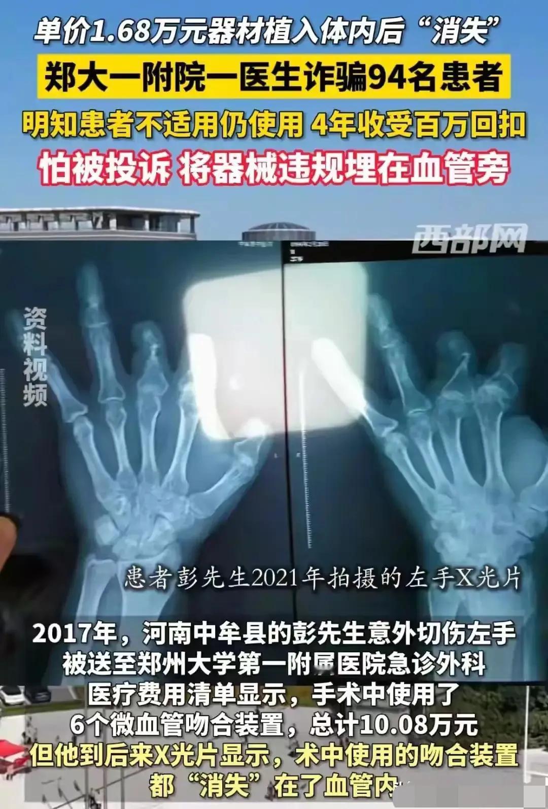 郑大一附院副主任医师王福建简直丧尽天良,经由他手术过的病患彭先生是河南中牟县人,出院清单显示,术中共使用6个微血管吻合装置,总计10.08万元。 彭先生怎么也想不到,自己2017年那次左手外伤的紧急手术,会在几年后变成一场彻头彻尾的骗局。当初为了保住左手,他和家人咬牙接受了这份天价账单,满心期待着昂贵的进口器材能让自己的手恢复如初。直到2021年复查时,一张X光片彻底撕开了这场医疗黑幕——本该牢牢固定在血管里的吻合装置,居然“消失”得无影无踪。更让人心寒的是,事后调查发现,王福建不仅没给彭先生植入这些器材,甚至明知道他的伤情根本不适用这种装置,只为了拿回扣就硬生生把手术费用套在了患者头上。 这不是个例,短短四年间,王福建用同样的手法欺骗了94名患者,涉案金额高达205万元。每台手术里,那些单价1.68万的微血管吻合装置,要么被违规埋在血管旁,要么干脆就没出现在患者体内。他一边收着器械商的百万回扣,一边把患者的身体当成谋利的工具,怕被投诉就用更危险的违规操作掩盖谎言,把患者的信任踩在脚下。 最让人愤怒的是,这种行为不仅是骗钱,更是拿生命开玩笑。微血管吻合装置本是用来修复血管的关键器材,王福建为了一己私利,让患者白白承受不必要的手术风险,术后还要在不知情的情况下带着隐患生活。 王福建的行为,不仅是对法律的公然挑衅,更是对医者仁心这一职业信仰的彻底背叛。他的落网,是法律的公正判决,也是对所有患者的一个交代。 各位读者你们怎么看?欢迎在评论区讨论。