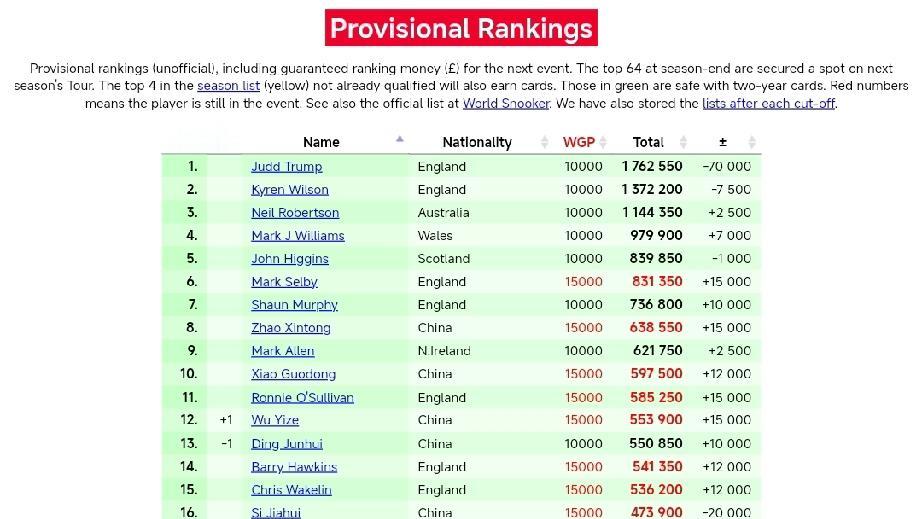赵心童 vs 马克·塞尔比 肖国栋 vs 罗尼·奥沙利文 2月4日,斯诺克2026香港世界大奖赛首轮战罢,约翰·希金斯、马克·威廉姆斯、贾德·特鲁姆普、凯伦·威尔逊、卫冕冠军尼尔·罗伯逊、肖恩·墨菲六位大满贯集体一轮游!世界排名前十出局八位,只剩马克塞尔比、赵心童和肖国栋。 是哪些球员淘汰了这六位大满贯得主? 袁思俊5-2贾德·特鲁姆普(世界第一) 肖国栋5-2凯伦·威尔逊(世界第二) 杰克·琼斯5-1尼尔·罗伯逊(世界第三) 张安达5-2马克·威廉姆斯(世界第四) 赵心童5-3约翰·希金斯(世界第五) 庞俊旭5-1肖恩·墨菲(世界第七) 中国军团九人晋级16强,取得了9胜1负的令人瞠目结舌的历史性大捷!必将载入史册! 今天开始16进8轮次的比赛,有两场内战,中国军团提前包揽两个八强席位! 焦点战: 赵心童对阵马克·塞尔比(19:00) 肖国栋对阵罗尼·奥沙利文(13:00)