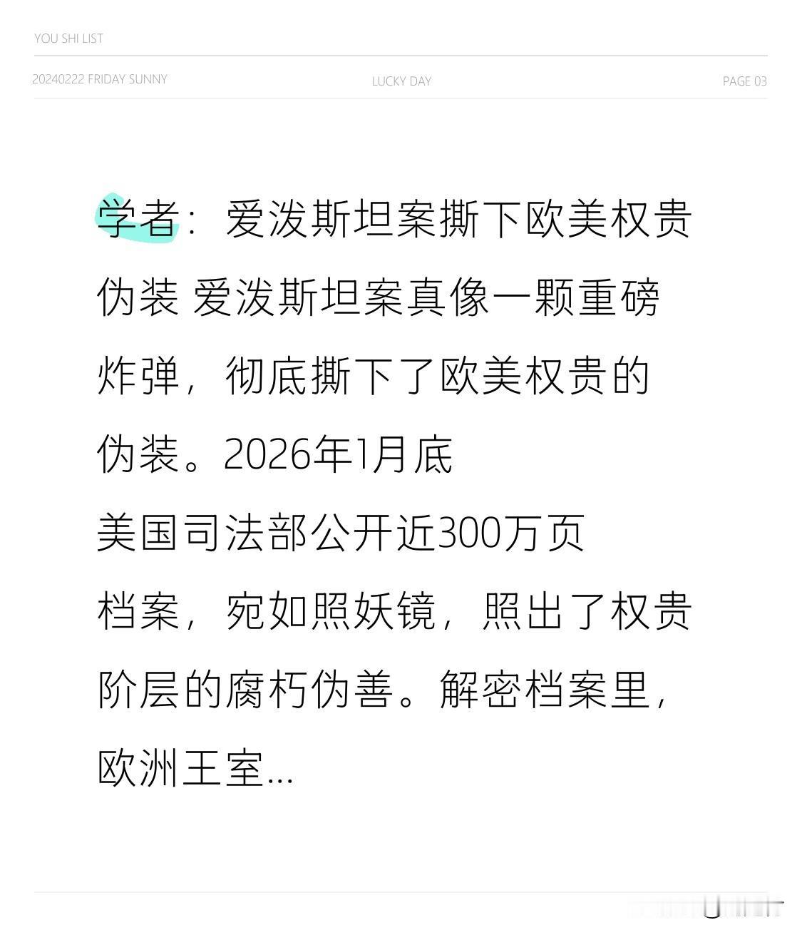 学者:爱泼斯坦案撕下欧美权贵伪装 学者:爱泼斯坦案撕下欧美权贵伪装 爱泼斯坦案如重磅炸弹,彻底撕开欧美权贵伪装。2026年1月底,美国司法部公开近300万页档案,如照妖镜般将权贵阶层腐朽伪善暴露无遗。 解密档案显示,欧洲王室与贵族深陷其中,英国安德鲁王子、挪威王储妃、西班牙前国王等均被牵扯。俄罗斯外交部发言人扎哈罗娃读文件时感到恶心,称这只是“冰山一角”。 这起案件并非孤立丑闻,而是权力与资本交织下系统性溃烂的体现。那些平日道貌岸然的政商名流,背后竟如此不堪。正义或许迟到,但不会缺席,期待更多真相浮出水面。