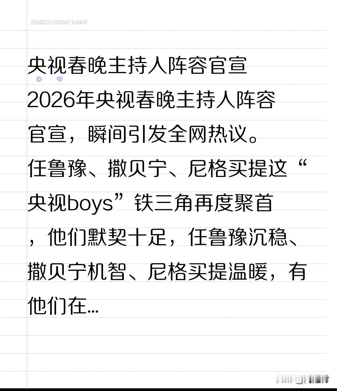 央视春晚主持人阵容官宣 央视春晚主持人阵容官宣!2026年央视春晚主持人阵容一经公布,便引发全网热议。任鲁豫、撒贝宁、尼格买提这“央视boys”铁三角再度聚首,默契十足。任鲁豫沉稳、撒贝宁机智、尼格买提温暖,有他们在,春晚就有了“定海神针”,守住了那份亲切的“年味”。 女主持人阵容同样亮眼,龙洋大气从容,马凡舒青春活力,刘心悦作为新生代黑马崭露头角。三地分会场主持人也各有风采。此次主持人搭配兼顾优雅、活力与新鲜感,让人对2026年春晚充满期待,静候除夕夜的精彩!