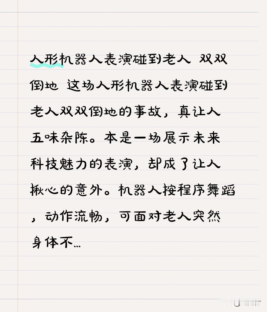 人形机器人表演碰到老人 双双倒地 人形机器人表演时碰到老人,双双倒地。这场意外着实让人百感交集。本是一场展现未来科技魅力的表演,却演变成令人揪心的意外事件。 机器人依照程序舞蹈,动作流畅自如。然而,面对老人突然身体不适倒地的状况,它却像个“愣头青”,应变能力极差。这暴露出机器人安全设计的短板,只注重表面的炫技,却忽视了对复杂状况的应对。 这一摔,摔出了科技“冷漠”的一面。机器人倒地后重启即可,老人倒地却要承受身体和心理的伤痛。科技发展不能只追求速度,更要以人为本,包容老人蹒跚的步履,让社会的温情永不“死机”。