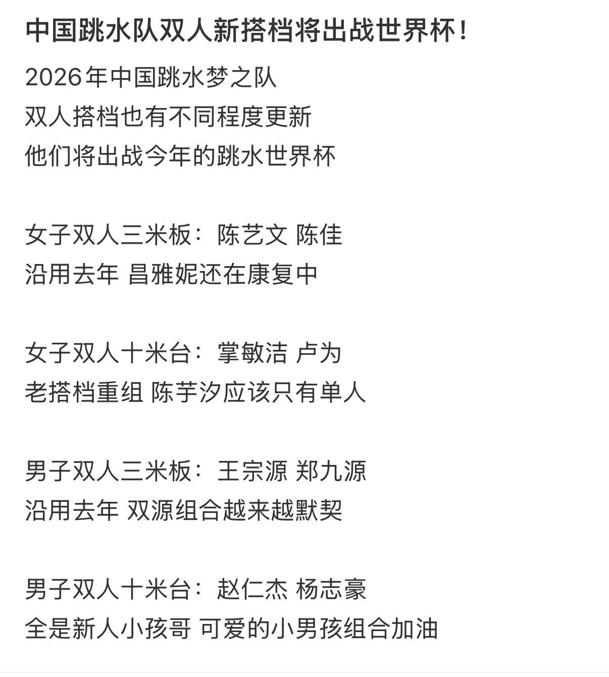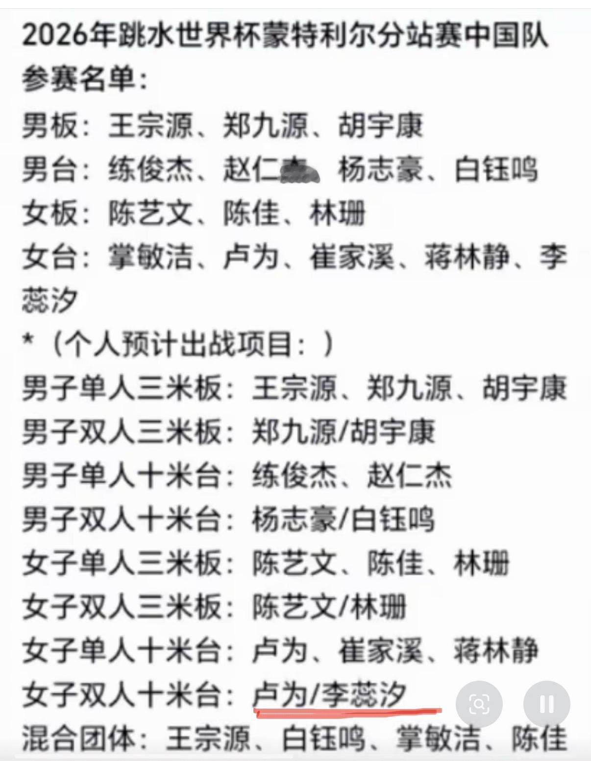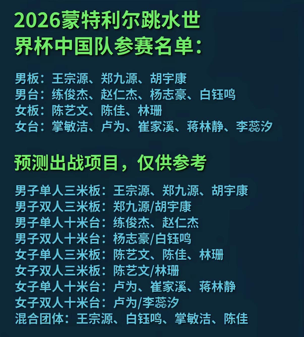 关于"陈芋汐缺席世界杯" 传言的全面事实核查 一一静待官方,勿信谣言 核心事实:官方尚未发布任何名单 截至目前,中国游泳协会、世界泳联等所有官方渠道,均未公布2026年跳水世界杯蒙特利尔站的参赛名单。在官方沉默时,任何所谓的“官宣“均为虚假信息。 三大漏洞,一眼识破谣言 一、时机不符常规 国家队重大赛事名单,通常于赛前2周公布。谣言刻意利用官方公布前的“静默期”,制造信息真空,误导公众。 二、名单不合常理 女子10米台项目派出5位选手,严重不符合国际大赛的常规参赛人数(通常为2 3人)。 名单中缺少当前国家队的已知主力与重点 "黑马"新秀,却包含了多位非现役国家队成员违背国家队选拔逻辑。 例如: 按照惯例,全运会前三名的选手才能进国家队资格,蒋林静前八都没进,怎么可能是国家队队员呢?如果她连国家队队员都不是,怎么能代表国家跳水队参加世界杯比赛? 三、内容自相矛盾 所有流传版本中,关键选手的姓名均出现低级不一致(如“章敏洁”与“掌敏洁”、“卢为”与“卢伟”、"李蕊汐"与“李睿希“、“崔家溪“与“崔佳溪“,还有女子 10米台双人跳搭档版本也不同,此乃编造信息最显著的标志。 我们的倡议:做理性粉丝,守清朗空间 1.只信官宣:一切信息以 中国游泳协会 世界泳联 的官方公告为准。 2. 不传不信:不点击、不评论、不转发来源不明的传言与伪造截图。 3.耐心支持:将最大的信任留给运动员与教练组。专业的备战安排,远比迎合谣言者的臆测更为重要。 网络信息纷杂,唯有事实为锚。作为真正的支持者,让我们共同抵制谣言,以冷静与耐心守护我们热爱的运动员与项目。请一起静候那则来自官方、值得所有人欢呼的正式消息。