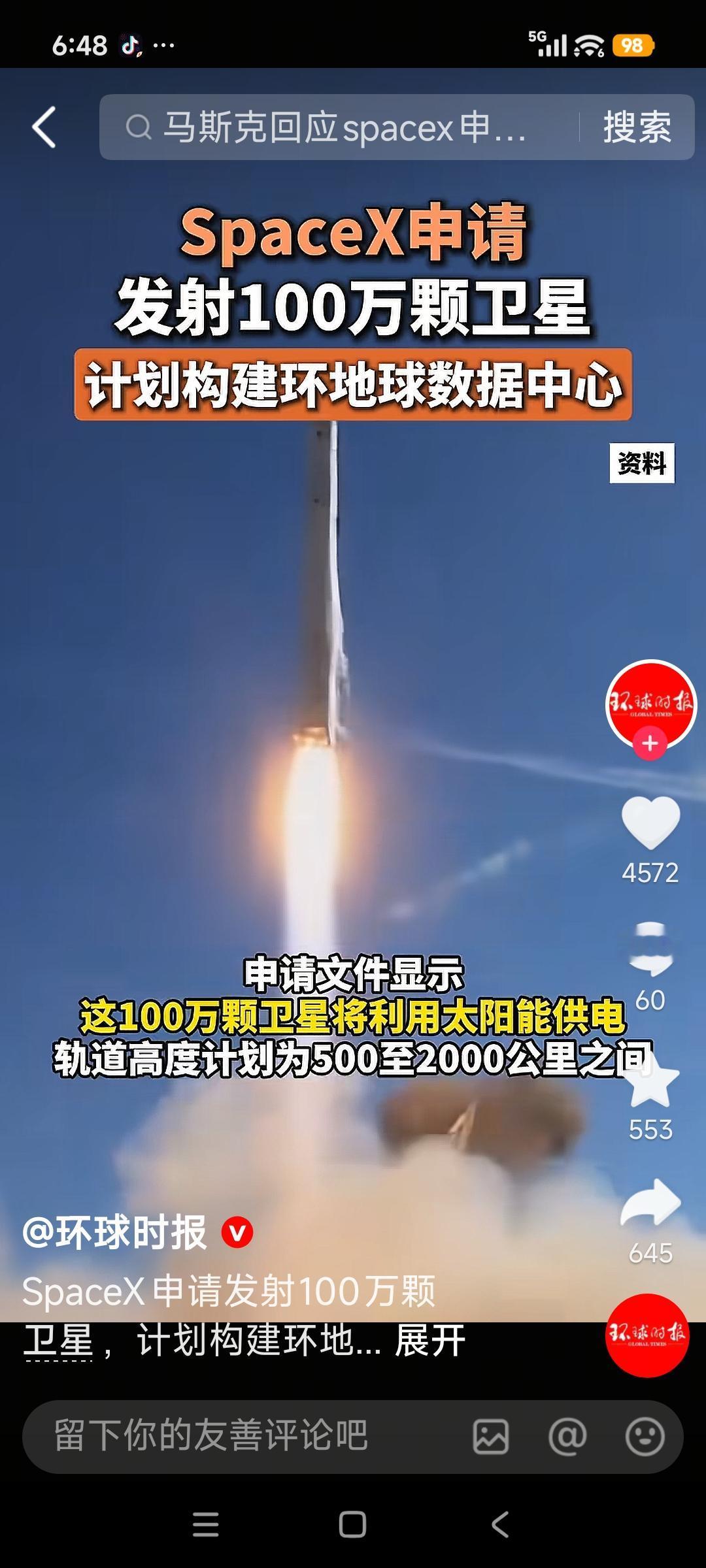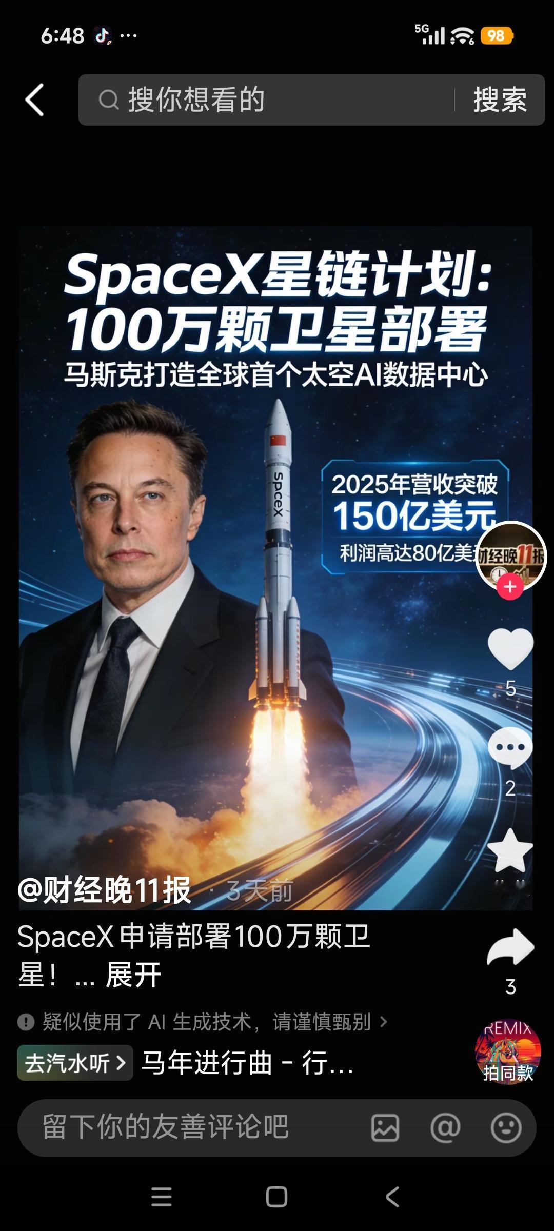 如何看待马斯克申报100万颗卫星马斯克申报百万颗卫星,看似为破解AI算力电力瓶颈建太空数据中心,实则是借AI+太空概念撑SpaceX IPO估值,更是抢占低轨频轨资源的战略卡位。这一计划远超工程实际,散热、辐射等技术难题未解,还将加剧轨道拥堵与太空垃圾风险,其背后是商业资本裹挟下的太空资源霸权争夺,与各国合规布局形成鲜明反差。