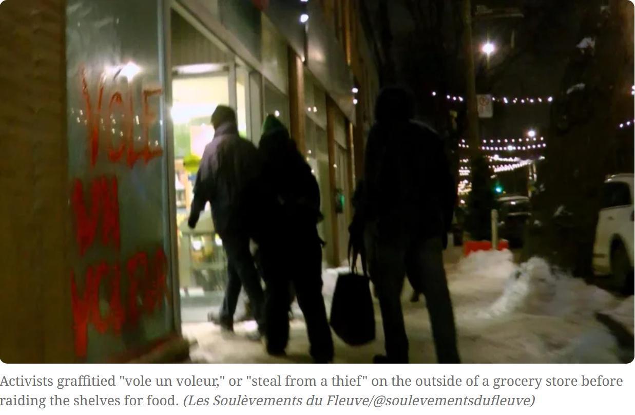 为了抗议不断上涨的食品价格,加拿大一伙窃贼扮成罗宾汉偷盗盗食物然后捐赠出去 当地时间周二晚间,加拿大一伙装扮成罗宾汉的窃贼突袭了蒙特利尔一家食品店,并将赃物赠送出去以抗议食品价格上涨,就在几周前,该团伙还装扮成圣诞老人和小精灵袭击了一家杂货店。 这个自称“巷子里知更鸟”的活动组织称,大约60人,其中一些戴着罗宾汉风格的羽毛帽,进入拉谢尔·贝里健康食品店,未经付款拿走食物,并分发到“城市许多社区冰箱”,声称这是对食品通胀的“政治行动”。去年十二月,同一团体成员装扮成圣诞老人和他的小精灵闯入蒙特利尔一家杂货店,偷走食物,并将部分食物包装成礼物放在附近的圣诞树下。 该组织一名成员称:“每天,我们都在不懈地工作,只为了能在那些利润驱动的超市里买到食物,当两份工作还不够吃饭、有个屋住、照顾好家人时,所有手段都变得合法。” Instagram发布的一段剪辑视频中,戴着口罩的人漫步穿过过道,拿走食物、药品、肥皂及其他物品。还有人用喷漆屏蔽店内外的监控摄像头。视频结尾,有人在砖墙上喷了“F**k Les Profits”。 蒙特利尔警方媒体关系官让-皮埃尔·布拉班特表示,警方于周三对盗窃案和涂鸦事件展开调查,事件中无人受伤,迄今尚无人被逮捕。 “关于赃物的金额和数量,我们没有,”布拉班特说。他估计这些货物的价值为“数千美元”,警方尚未找回任何物品。 至于去年十二月的圣诞盗窃案,布拉班特表示“目前仍在调查中”,但尚未有人被逮捕。