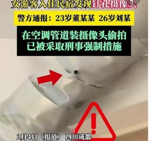 90元民宿藏针孔摄像头!2名男子被刑拘,背后真相比你想的更可怕 两女生花90多元入住成都民宿,本想享受平价旅行的惬意,却在空调管道里揪出了隐藏的摄像头,冰冷的镜头对准床铺,将私密空间变成了“直播现场”。警方通报一出,全网炸锅:23岁董某某、26岁刘某借入住之机安装自制拍摄装置,与民宿经营者无利益关联,目前已被采取刑事强制措施,涉案设备与存储内容全部扣押,暂未发现视频外传。 可即便如此,网友的恐惧丝毫未减。谁能想到,几十块钱的住宿背后,藏着如此险恶的用心?空调管道、烟雾报警器、插座面板,这些本该是安全设施的角落,如今成了窥私者的“狩猎场”。这两个年轻男子,并非临时起意,而是精准踩中了民宿管理的漏洞——低价民宿疏于排查,外来人员可随意安装设备,退房后便逍遥法外,把他人的隐私当成满足私欲的工具。 更让人细思极恐的是,这绝非个例。近年来,民宿偷拍事件频发,从插座到路由器,从镜子到空调风口,摄像头伪装得越来越隐蔽,普通住客根本难以察觉。有人说,民宿方无共谋就无需担责,可客房安全本就是经营者的底线,连最基本的定期排查都做不到,90元的低价难道成了疏于管理的借口? 警方快速破案、严惩嫌疑人,是对违法行为的有力震慑,也让我们看到法律对隐私的守护。但更重要的是,这起事件给所有人敲响警钟:外出住宿,安全永远是第一位。入住后务必检查空调管道、插座、镜子等高危区域,用手机相机扫描红外光点,发现异常立即报警。 隐私不是小事,偷拍必受严惩。希望这起案件能倒逼民宿行业加强管理,也愿每一位出行者,都能在陌生的城市里,住得安心、睡得踏实,不用再在本该放松的时刻,时刻提防暗处的眼睛。你住民宿时遇到过可疑情况吗?评论区聊聊你的防偷拍经验!民宿隐藏摄像头# 偷拍摄像头