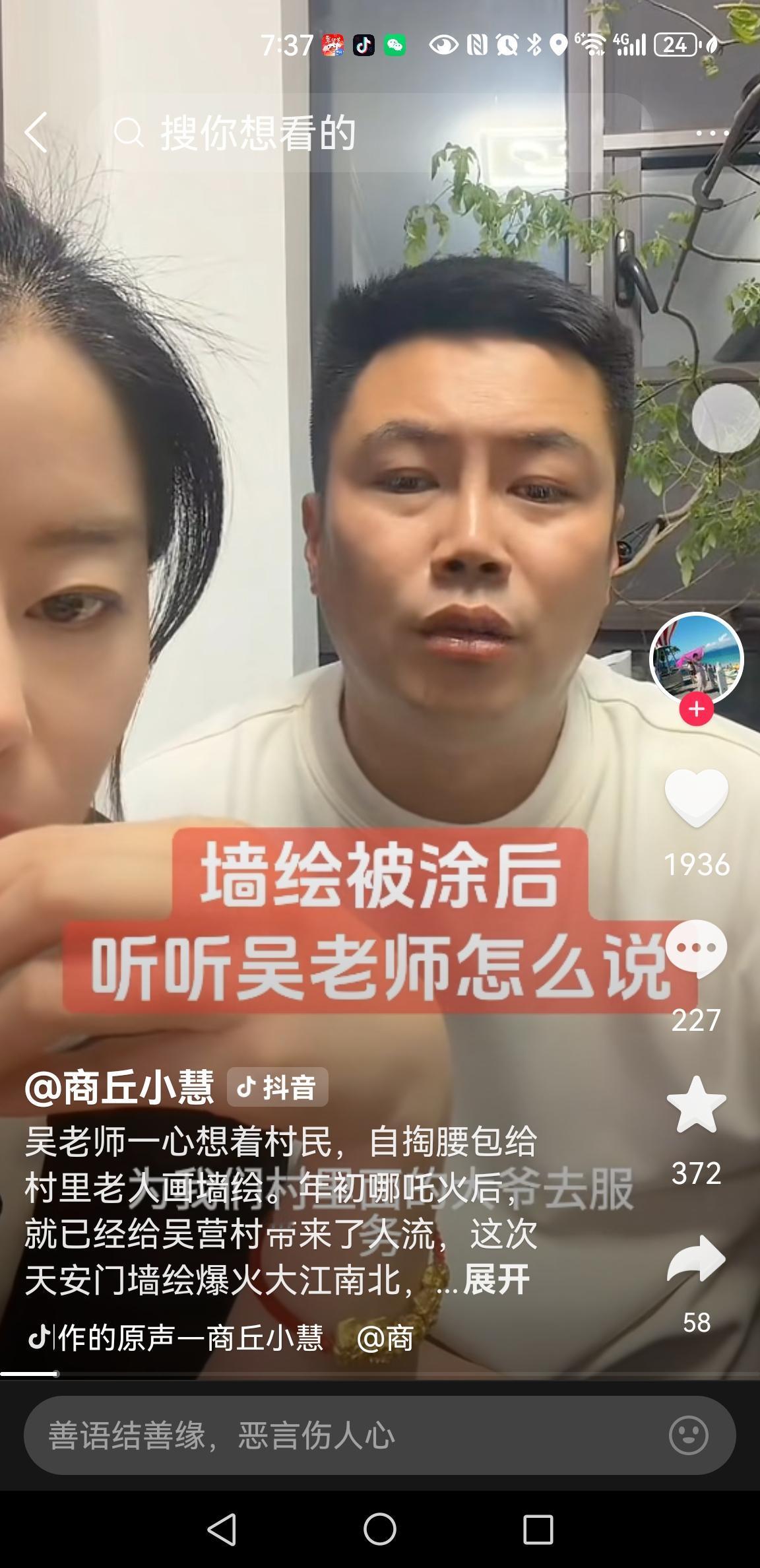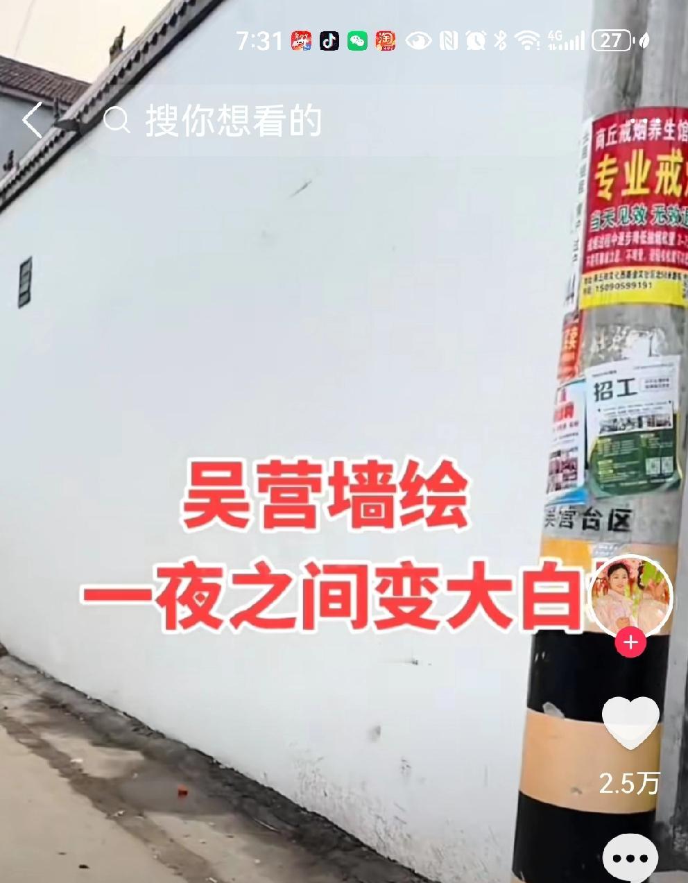 吴营村一幅“开国大典”墙绘被涂白。 昨天晚上,吴承言在直播间确认,这是真的。 目前,这幅被涂白的墙只剩下两个窗户,没有涂白。 吴承坦言,这事不是本村人干的。 同时,吴承言和媳妇直播时,手机遭短信轰炸。无奈之下,拔掉了电池,手机才恢复正常 ! 吴承言的墙绘,带火了吴营村,圆了村里老人的梦想,也让吴营村成了全国闻名的网红打卡地。 最最重要的是,增加了村民的收入,让这些祖祖辈辈靠种田为生的农民们,有了新的谋生手段。 吴承言多次说,一个人富不算富,要带领乡亲们一起富!这是他画墙绘的初心! 万万没想到,吴承言的墙绘被涂白,这是羡慕嫉妒,还是恨? 吴承言干了一件天大的好事,但是…人心不古啊! 网上流传着领导对此事的解释,惹怒了村民,大家自己去听吧! 此事应该不难查,希望警方能够彻查! 同时,保护好墙绘,更要保护好吴承言画家!