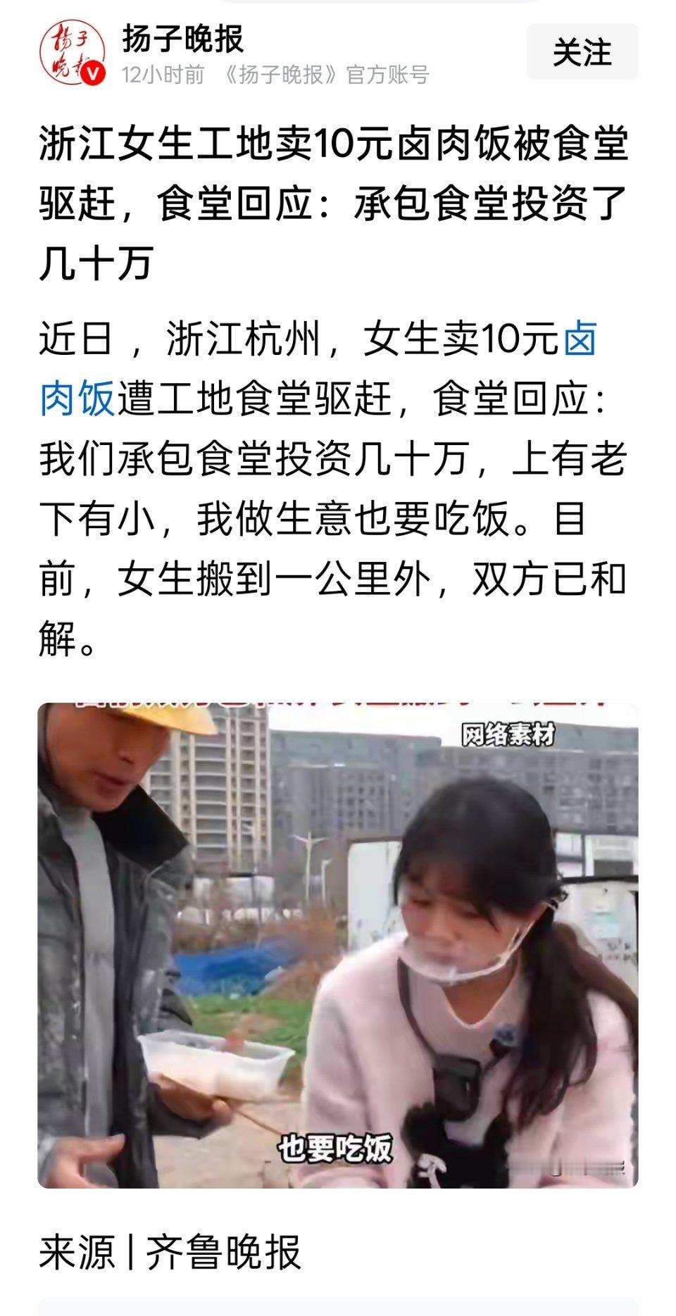 浙江女生工地卖10元卤肉饭被食堂驱赶,食堂回应:承包食堂投资了几十万。你怎么看?