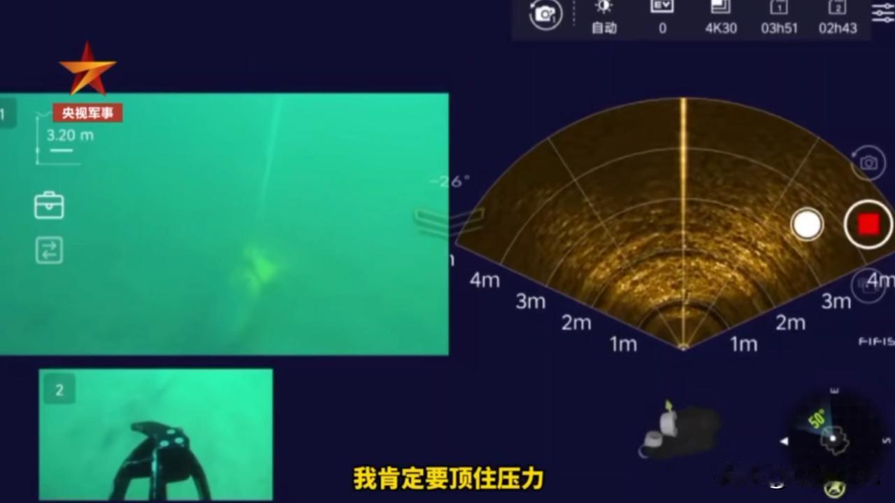 央视首次公布,我国水下排爆机器人,到底有什么亮点? 官媒,首次公布北部战区组织的内港水下排爆训练,而且,都是无人装备实施,第一次见到潜水水下排爆机器人,不仅可以抓取水下未爆弹,转移到水面,进行处置,还可以扫描水下地形,生成水下影像,更好的判断和作业! 而且,还公开了水下机器人的作业画面,这是极其罕见的,不仅有机器人视角,还有雷达探测画面,从画面上看,水下排爆机器人,还可以录制4k30帧高清任务视频,右上角,还有3h51,和2h43的字样,这很可能就是,两种模式下的续航剩余时间,这么看的话,续航能力还是很强的! 另外一个雷达画面,可以看到780m,830m,这个不知道是距离目标的距离,还是下潜的深度? 大家觉得呢? 评论区说说你的看法!深海作业机器人 水下清机器人