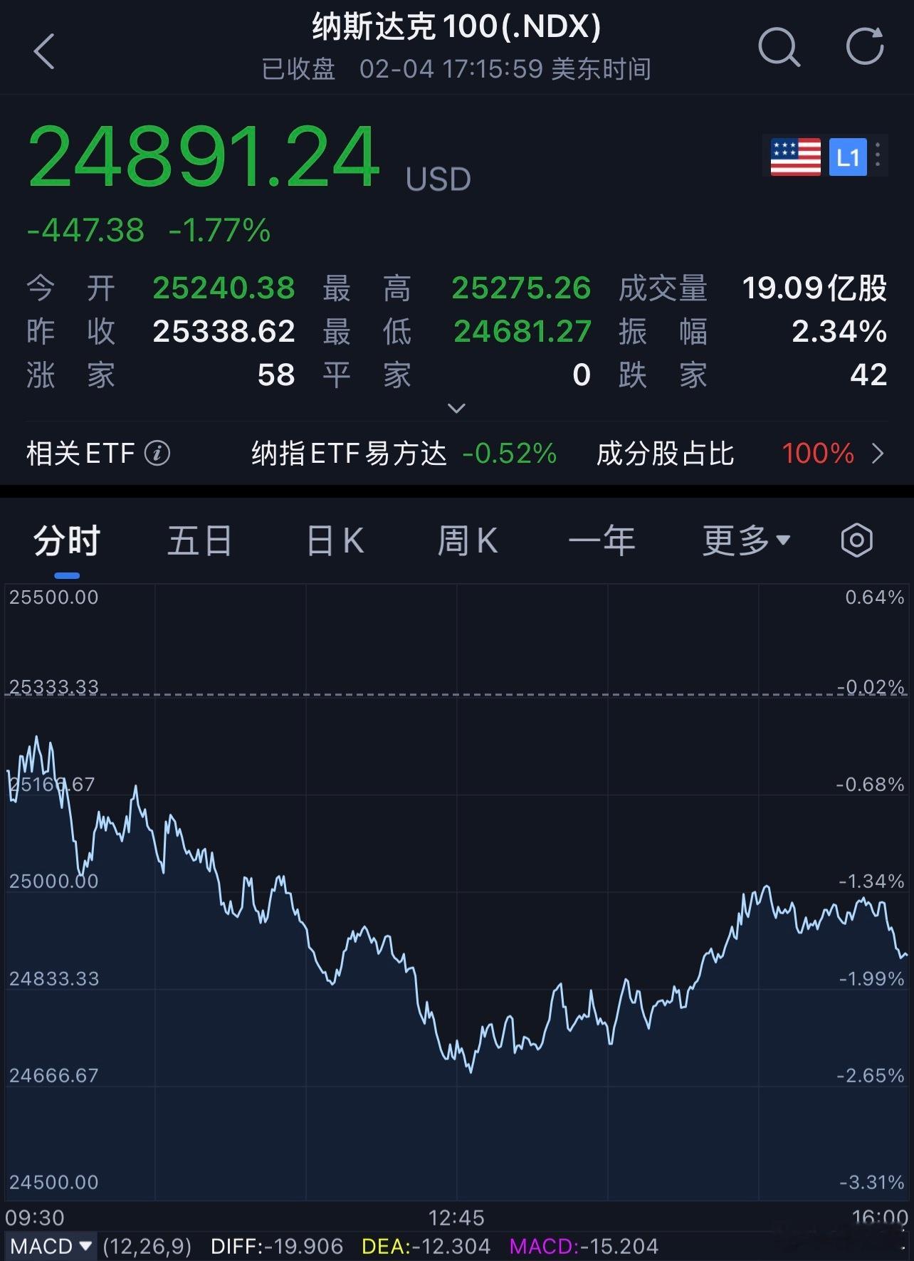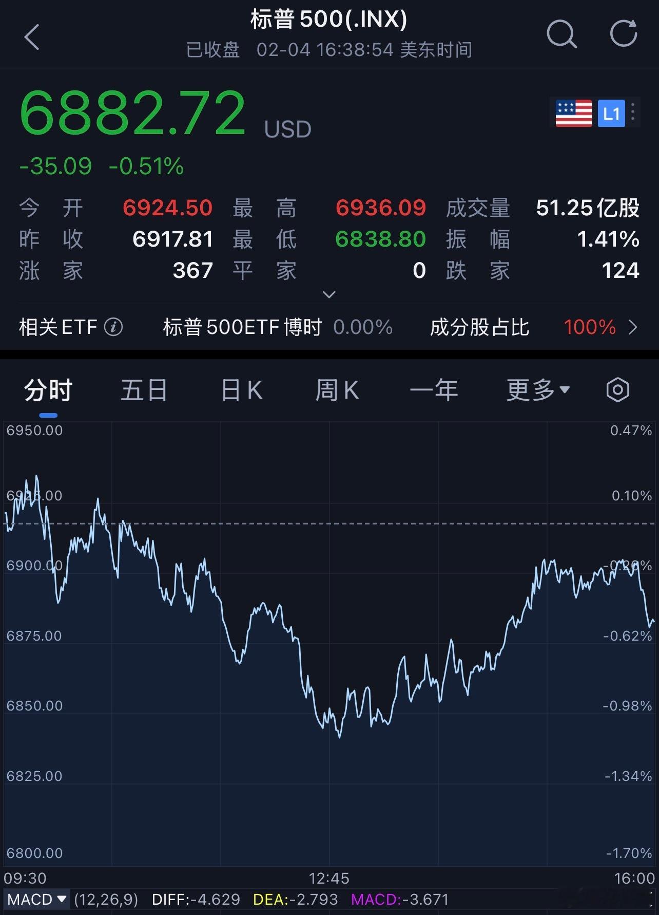 截至收盘,标准普尔500指数跌0.51%,报6882.72点;纳斯达克综合指数跌1.51%,报22904.58点;道琼斯工业平均指数涨0.53%,报49501.3点。连续两日下跌后,纳指也跌破了100日均线。