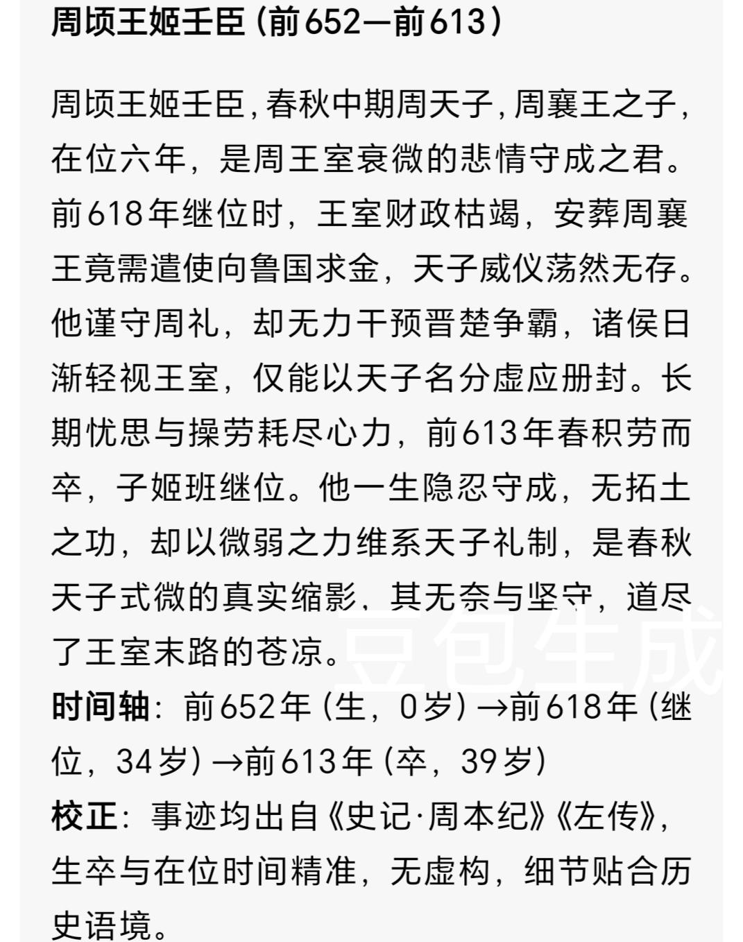周顷王在位6年,天子借钱葬父,周室尊严何存? 谁能想到,堂堂周天子,竟要放下身段向诸侯低头求金,只为让父亲的灵柩早日入土为安?周顷王姬壬臣(jī rén chén),这位东周第七任君主,在位仅6年,却在财政枯竭、卿士争权、诸侯争霸的夹缝中,把周王室的窘迫与无奈,刻进了春秋的历史肌理。当晋楚的战鼓响彻中原,洛邑(luò yì)宫墙内的天子,连维系最基本的王室威仪,都成了遥不可及的奢望。 继位之殇:停灵的灵柩与空瘪的国库 公元前618年,周襄王的灵柩静静停在洛邑宗庙的偏殿,烛火在寒风中摇曳,映得殿内的青铜礼器泛着冷光。姬壬臣在一片哀戚中继位,可他还没来得及感受身为天子的荣光,就被眼前的困局压得喘不过气。他亲手翻开王室的账簿,上面的字迹潦草又刺眼:王畿(wáng jī)之地仅剩洛阳周边百里,赋税仅够维持宫室日常用度,历年的积蓄早已在诸侯朝聘、王室祭祀中消耗殆尽。 按周礼,天子葬礼需用九鼎、配七佾之舞,耗费金帛无数,可此时的王室,连置办棺椁的费用都凑不齐。姬壬臣站在灵柩前,指尖攥紧了腰间的玉圭,指节泛白。他深知,若不能按礼制安葬先王,周室的礼乐尊严将彻底崩塌。万般无奈下,他只能派卿士毛伯卫远赴鲁国求金。《左传·文公九年》冷冷记下这笔屈辱:“毛伯卫来求金,非礼也。” 要知道,周天子本是天下共主,诸侯纳贡是本分,可如今,天子竟要主动求“贡”,这是周室东迁以来,从未有过的窘迫。 毛伯卫一路风尘仆仆赶到鲁国,对着鲁文公行的不再是天子卿士的威仪之礼,而是近乎恳求的姿态。鲁文公虽心中鄙夷,却也不愿落个“不尊王室”的骂名,最终送来金帛与器物。这场迟来的葬礼,终于在数月后草草落幕,可姬壬臣心中的屈辱,却像一根刺,扎了整整一生。 朝堂困局:卿士争权与天子失语 葬礼的尘埃刚落,朝堂的纷争又起。周公阅与王孙苏两位卿士,为了争夺执政之权,早已势同水火。周公阅倚仗宗室身份,把持祭祀与礼乐之权;王孙苏则拉拢近臣,觊觎朝政实权。两人常常在朝堂上吵得面红耳赤,丝毫不把刚继位的姬壬臣放在眼里。 有一次,两人为了争夺洛邑郊外的田邑,竟带着各自的家臣在宫门外对峙。姬壬臣闻讯赶来,看着剑拔弩张的场面,只能站在中间反复调解。他想斥责周公阅恃宠而骄,却怕失去宗室支持;想呵斥王孙苏以下犯上,又怕对方恼羞成怒发动内乱。最终,他只能将田邑一分为二,勉强平息纷争,可两位卿士的不满,却写在了脸上。 此时的中原,诸侯早已不把周室放在眼里。晋国主持新城之盟,召集齐、鲁、宋等诸侯商议伐卫,却连一道邀请天子的诏书都没发;楚国北上问鼎,兵锋直逼中原,更是将周天子的权威视若无物。姬壬臣曾想派使者前往诸侯国会盟,以天子之名调停纷争,可算来算去,连使者的路费与礼品都备不齐,只能作罢。他坐在空荡荡的朝堂上,听着宫外传来的诸侯争霸的传闻,心中满是无力——这天下,早已不是周天子的天下了。 中原乱局:晋楚争霸与王畿飘摇 周顷王在位的6年,正是晋楚争霸最激烈的时期。晋国凭借城濮之战的余威,称霸北方;楚国则厉兵秣马,试图北上争夺中原霸权。两大强国的交锋,让夹在中间的周室王畿成了“四战之地”,边境的小城时常被晋楚的游骑侵扰,百姓流离失所,赋税更是雪上加霜。 姬壬臣并非没有重振王室的心思。他曾想效仿先祖,整顿王畿的军队,可国库空虚,连士兵的粮饷都发不出;他想重新制定礼乐,约束诸侯,可诸侯们连天子的诏令都懒得回应。有一次,郑国擅自侵占周室的温邑,姬壬臣派使者前去质问,郑君却笑着打发使者:“天子安坐洛邑,何必管这百里之地?” 使者回来禀报时,姬壬臣沉默了许久,最终只是挥了挥手,让使者退下。 他深知,周室的衰落早已积重难返。自平王东迁以来,王室的土地不断被诸侯蚕食,兵力日渐衰微,礼乐制度也在诸侯的僭越中逐渐崩坏。他就像一个守着破屋的老人,明明知道房屋即将倒塌,却连一根支撑的木头都找不到,只能眼睁睁看着它一步步走向倾颓。 落幕:短暂一生与王室悲歌 公元前613年春,洛邑的桃花刚开,姬壬臣就因积劳成疾,一病不起。他躺在病榻上,看着窗外的春色,眼中满是遗憾。他这一生,没有享过天子的尊荣,只有无尽的隐忍与妥协;没有留下赫赫功绩,只有一段关于周室窘迫的记忆。 他去世后,儿子姬班继位,是为周匡王。可周室的困局,丝毫没有缓解,反而愈发严重。姬壬臣的一生,是东周王室衰落的缩影。他没有昏庸无道,也没有荒淫误国,只是生在了一个周室无力回天的时代。他的隐忍,不是懦弱,而是乱世中无奈的生存之道;他的妥协,不是放弃,而是对王室最后的守护。 在那样的乱世里,如果你是周顷王,会选择奋力一搏还是隐忍苟全?周室的衰落,是时势使然还是君主之过?欢迎在评论区留下你的看法~东周列国志 周顷王