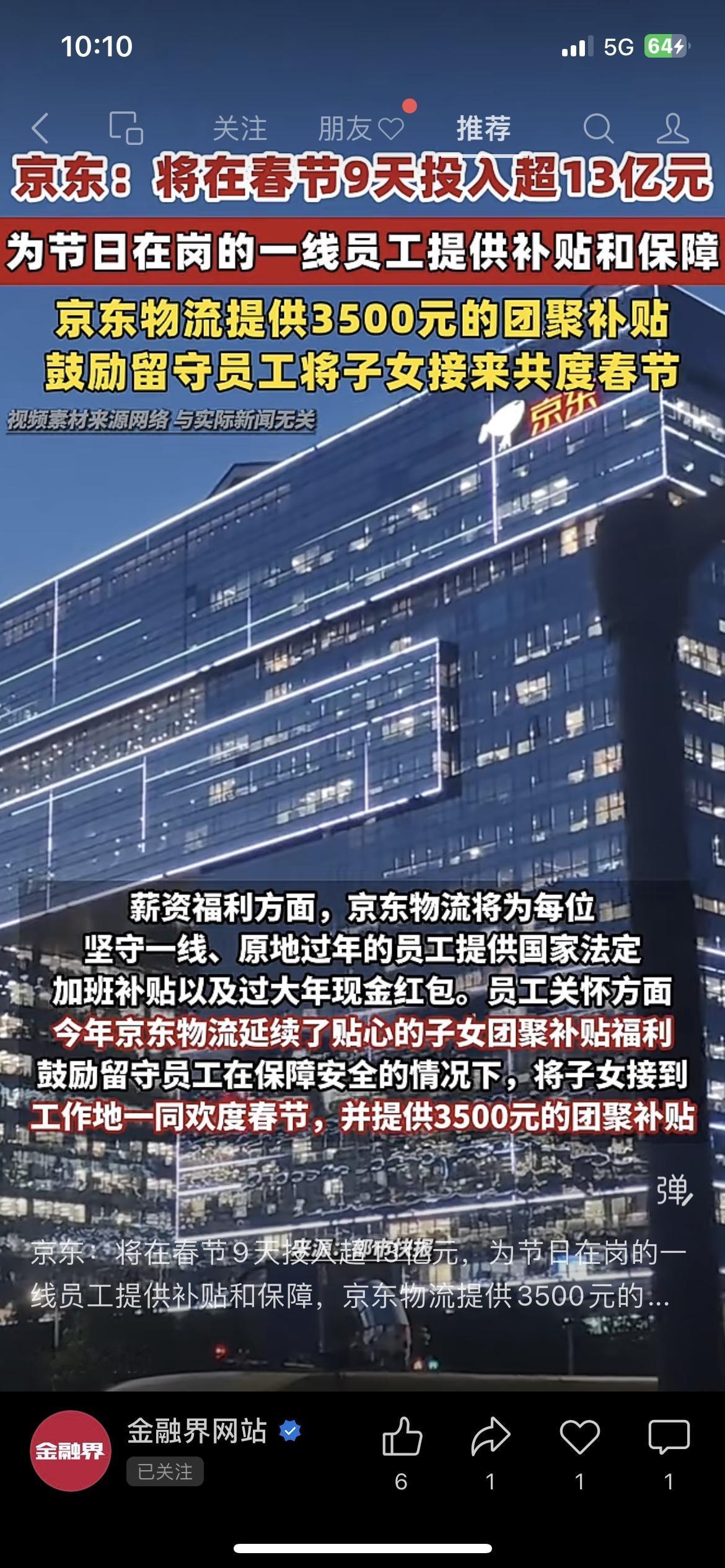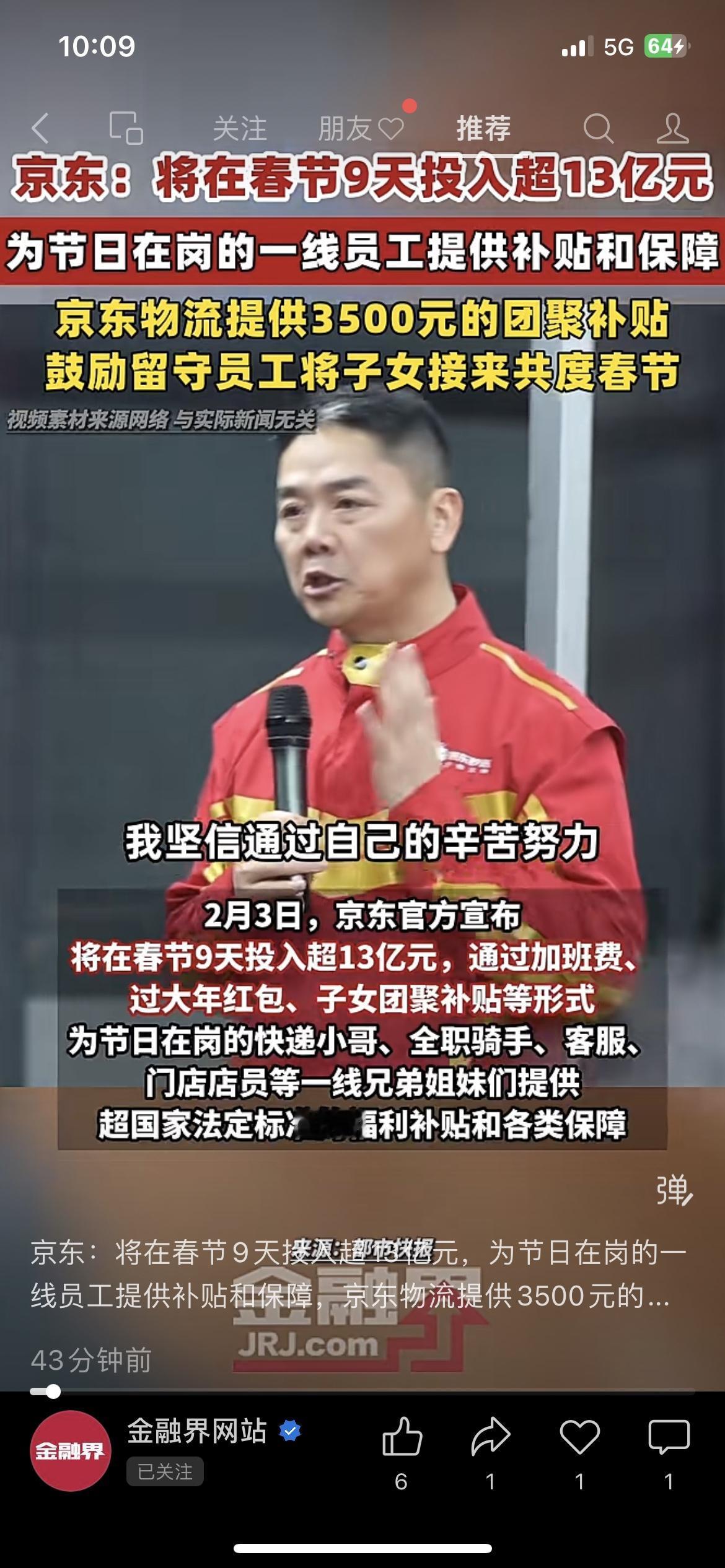 京东砸13亿!春节留守快递员拿3500元补贴! 京东春节9天投超13亿,给一线员工发补贴,物流还给3500元团聚补贴,鼓励把孩子接来过年。这才是企业该有的温度! 打工人坚守岗位,就该拿到真金白银的实惠! 你觉得这种企业补贴值得推广吗? 民生热点 京东春节福利