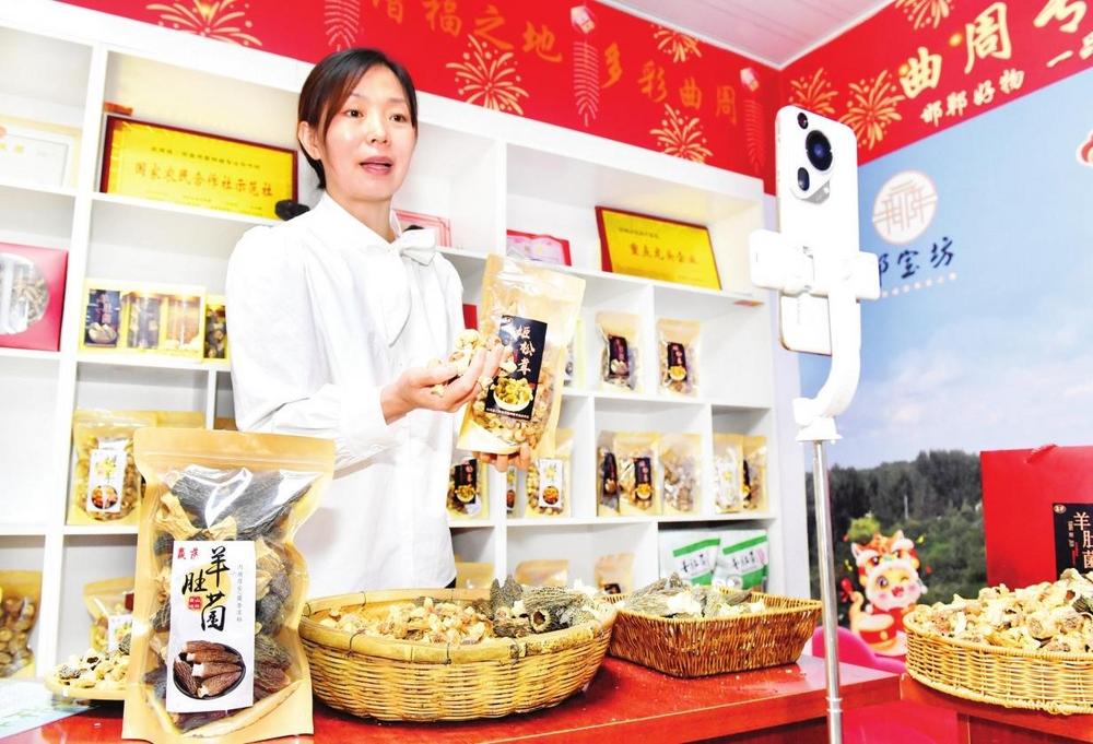 “一品一播”助力农村特色产业发展,拓宽乡村致富新渠道。图为曲周县羊肚菌、姬松茸直播现场。本报记者李磊摄