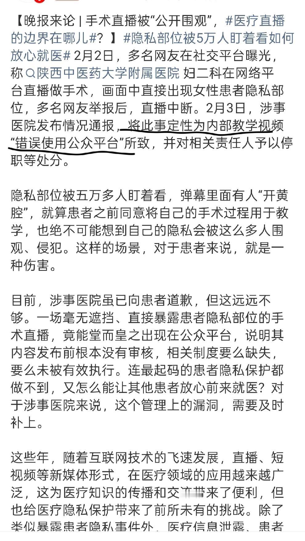 陕西某附属医院在网络平台直播做妇科手术,画面中直接出现女性患者隐私部位,高峰期观看人数达5万多人,有人在直播间弹幕开黄腔。 该直播间被举报后中断直播。 2月3日涉事医院称,已经关注到此事,目前正在处理中。 网络上视频是关于恢复私处的手术,不知道这样开直播能不能赚到钱? 靠暴露患者隐私来吸引人,感觉当医生前应该好好的先学会咋当人! 而不是找借口,说是学习视频。 这个理由有人相信么? 手术直播
