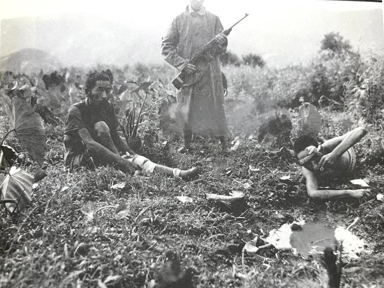 1944年,滇西反攻战中松山,战役结束后两名日军战俘深陷在荒草丛生的泥泞野地中,左侧的战俘瘫坐在地,腿部缠着简陋的绷带,眼神木讷地望向镜头;右侧的战俘趴在泥洼里,低头凑向积水取水。中间站立的中国士兵身着军装,手持步枪保持警戒。 1944年9月3日,中国第8军经过95天的惨烈攻坚,终于攻克日军重兵设防的松山据点,彻底打通了滇缅公路的关键节点。这张照片记录的正是战役结束后,士兵在松山附近村落搜捕到残余日军战俘的场景。
