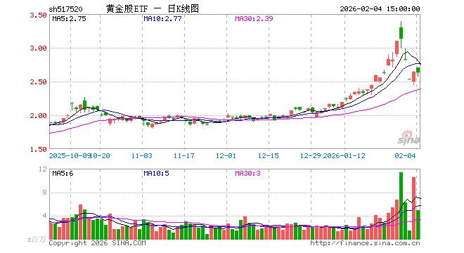 2月4日,黄金股ETF(517520)跌0.23%,成交额12.96亿元。当日份额减少3.16亿份,最新份额为65.35亿份,近20个交易日份额增加5.13亿份。最新资产净值计算值为172.40亿元。