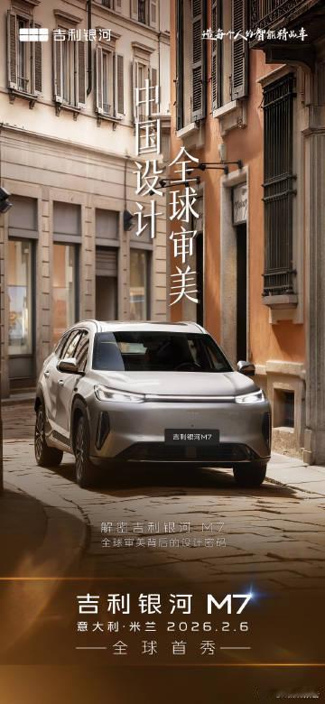 吉利银河M7来了吉利银河M7将于2月6日在意大利米兰全球首秀,此次将揭晓其契合全球审美的设计密码。