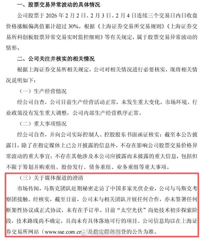 【马斯克团队考察接触?晶科能源两日大涨近36%,紧急澄清!事关太空光伏,多只牛股集体公告】 2月3-4日晶科能源股价累计涨35.92%,伴随市场传闻。晶科能源、高测股份澄清未与马斯克团队开展合作;晶科、国晟科技、双良节能均表示未开展太空光伏相关业务,该概念未影响业绩。晶科披露2025年预计归母净利润亏损59-69亿元,因组件价格低、高功率产品占比低及资产减值。晶盛机电称太空光伏产业化存在不确定性。中国光伏行业协会指出太空光伏技术处于初期,砷化镓电池是当前航天主流,HJT钙钛矿技术距大规模商业化尚远。详情:马斯克团队考察接触?晶科能源两日大涨近36%,紧急澄清!事关太空光伏,多只牛股集体公告