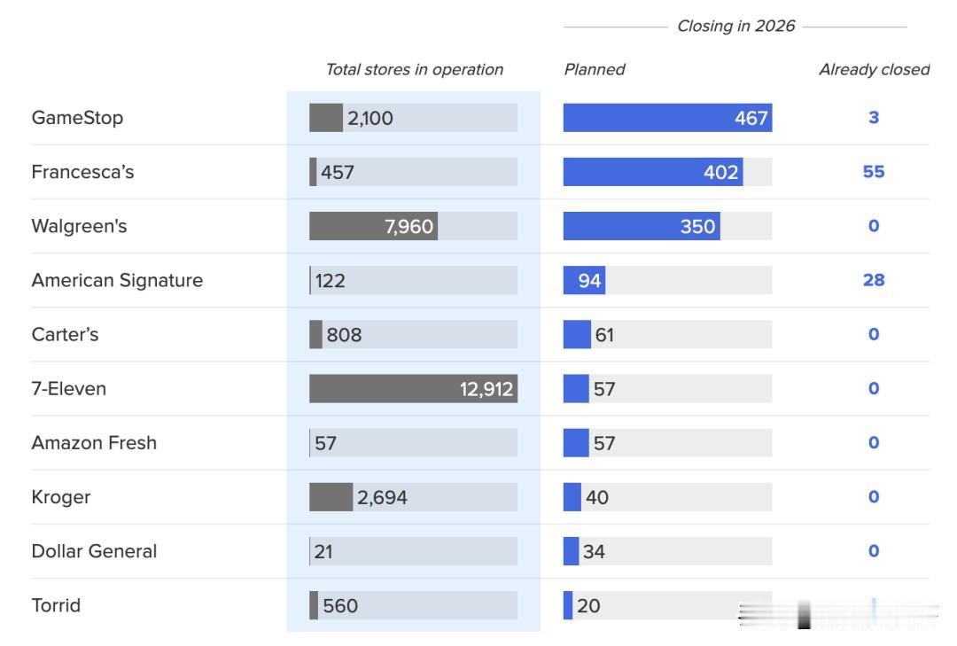 美国多家连锁店26年继续裁员关店 近几年在美国随着互联网服务广泛应用,人工智能大量被应用在服务当中,人们已经在疫情中习惯了网购商品,网上理财和网上完成一切所需的服务项目,除了餐饮店之外,都不需要再去实体店,连证件照都有软件可以替代摄影店完成。 现在美国流行的是尾货仓库店,大量各类的大牌尾货以优惠的价格冲击品牌连锁店,以至于像forever 21这样的多年品牌店在价格竞争中轰然倒下,所有的门店都2025年关闭结束营业。 踏入2026年,亚马逊生鲜超市也无可避免地列出了关店计划,沃尔格林药房继续关闭上千家门店,作为Neiman Marcus 旗下的奥莱折扣线,Last Call门店已基本退出线下市场。实体电玩零售持续承压,GameStop仍在关闭部分门店。7-11也受到网购冲击,是零售关店中最为显眼的,有57家门店在今年计划关闭。 美国的裁员潮也是世界的一个缩影,网购+人工智能,正在改变人类的生活习惯和就业方向,马斯克曾经说过2027年将是人工智能的奇点,未来的实体商业经营模式,可能会出现巨大的变化。