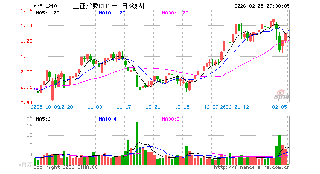 2月5日,上证指数ETF(510210)开盘跌0.39%,报1.025元。上证指数ETF(510210)重仓股方面,农业银行开盘涨0.00%,中国石油涨0.47%,贵州茅台跌0.33%,工业富联跌2.13%,中国银行涨0.37%,紫金矿业跌2.63%,中国神华跌1.23%,中国人寿涨0.35%,招商银行跌0.18%,中国平安跌0.34%。