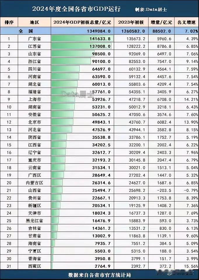 31个省市自治区"成绩单"发布,你的家乡排名几何? 2025年31个省份GDP达1401879亿元,比2024年的 1348066亿元净增53813亿元,圆满完成了年初制定的5.0%的增长任务。 广东GDP总量仍然高居榜首, 实现"37连冠"; 江苏GDP首破14万亿元,位居第二; 山东首破10万亿元,成北方首个"10万亿省份"; 河南成十强省"增速冠军"; 西藏地区生产总值增速位列全国第一; 新疆居然排在天津之前跨入2万亿的序列;要知道甘肃的天水都比乌鲁木齐繁华,可甘肃距离新疆还有四个段位,怪不得大半个甘肃人都跑来新疆DG,新疆真没必要跑出去,家门口的qian都不挣,白瞎哈!中国GDP排行 全国GDP排行 各省GDP排行 省市经济排名 十强省gdp