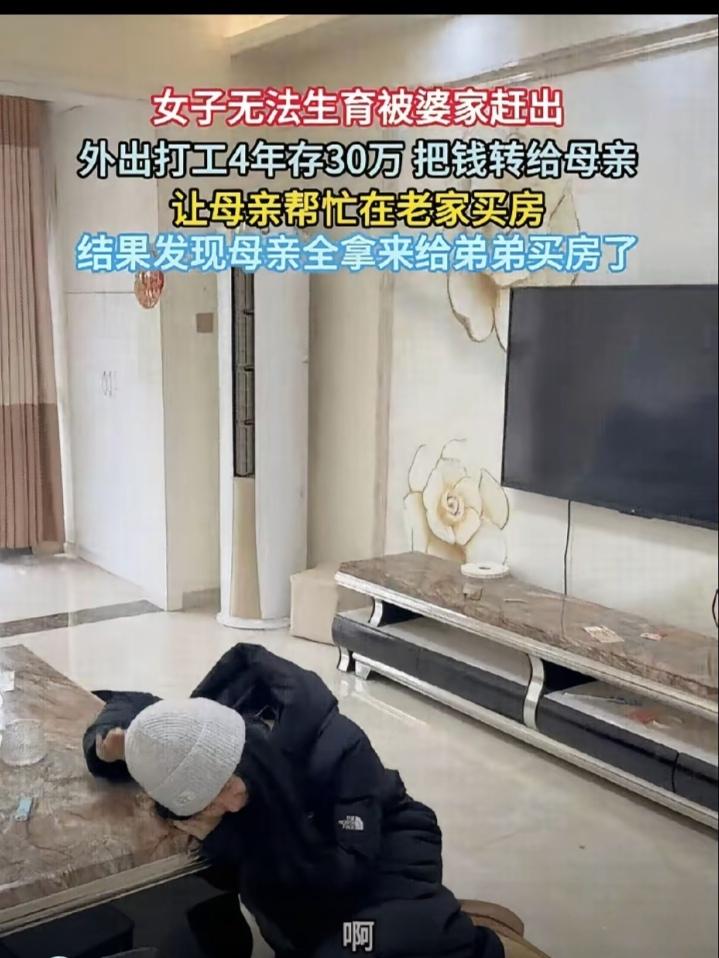 这女子实在是太惨了!因无法生育被迫离婚,这已然十分悲催。外出打工好不容易攒下30万,转给母亲,指望母亲能在老家给自己买套房。房倒是买了,可竟是母亲给弟弟买的!这双重背叛让女子痛不欲生。 其实女子长这么大,家里有弟弟,难道还看不出母亲偏心吗?还这般信任母亲,把30万血汗钱转给她,这不是肉包子打狗有去无回吗?算了,认栽吧,就当用这笔钱买断母亲的养育之恩。离开吧,接着出去打工,永远别回来,这里压根就不是你的家! 离婚的苦还没咽下去,又被亲妈往心口插刀。三十年的养育情,竟抵不过给儿子买房的私心,这哪是亲妈,分明是把女儿当摇钱树。 女儿在外吃苦受累攒的血汗钱,转头就成了儿子的婚房,连句商量都没有,这份偏心偏到骨子里了。寒心的不是钱没了,是掏心掏肺的信任,换来的全是算计。这30万买断恩情太值了,这样的家,不回也罢,往后好好为自己活,比啥都强。