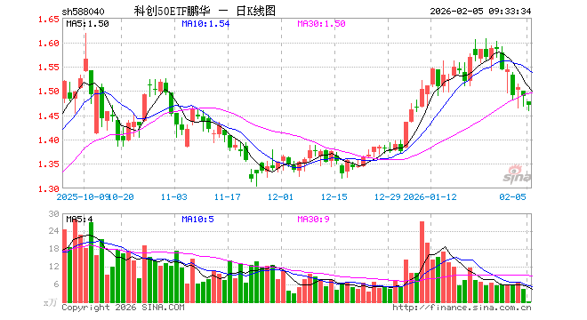 2月5日,科创50ETF鹏华(588040)开盘跌0.74%,报1.477元。科创50ETF鹏华(588040)重仓股方面,中芯国际开盘跌1.61%,寒武纪跌1.68%,海光信息跌2.11%,澜起科技跌5.28%,中微公司跌2.64%,金山办公跌1.32%,联影医疗涨0.04%,拓荆科技跌3.47%,芯原股份跌4.04%,沪硅产业跌1.28%。