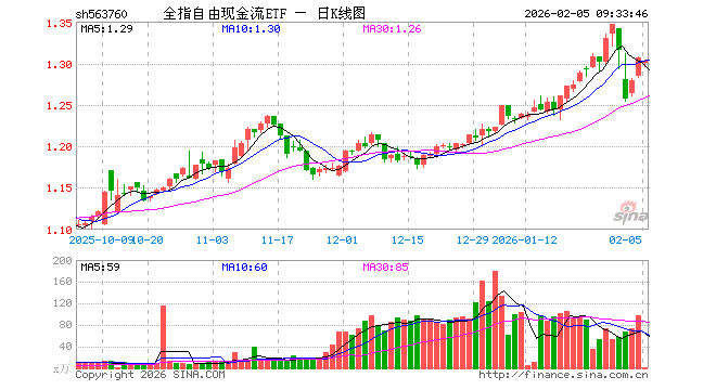 全指自由现金流ETF(563760)业绩比较基准为中证全指自由现金流指数收益率,管理人为中银基金管理有限公司,基金经理为赵建忠,成立(2025-05-21)以来回报为30.47%,近一个月回报为7.24%。
