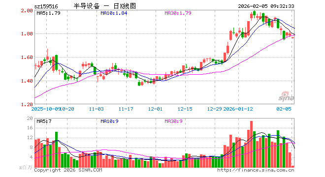 2月5日,半导体设备ETF(159516)开盘跌2.11%,报1.761元。半导体设备ETF(159516)重仓股方面,北方华创开盘跌1.61%,中微公司跌2.64%,拓荆科技跌3.47%,长川科技跌2.04%,沪硅产业跌1.28%,华海清科跌1.71%,中科飞测跌1.86%,南大光电跌1.61%,安集科技跌1.70%,芯源微跌1.94%。