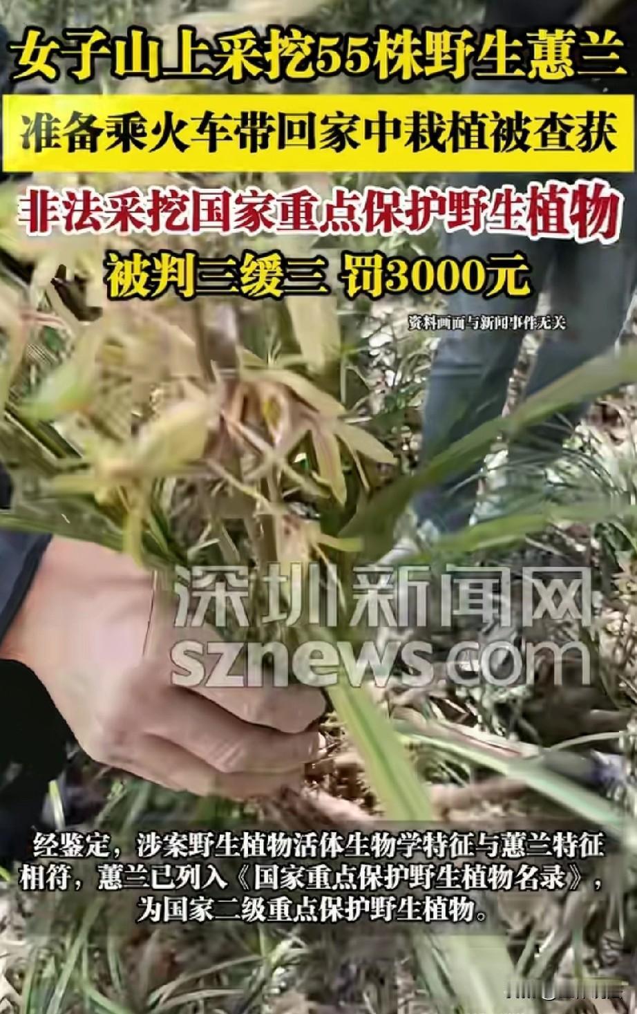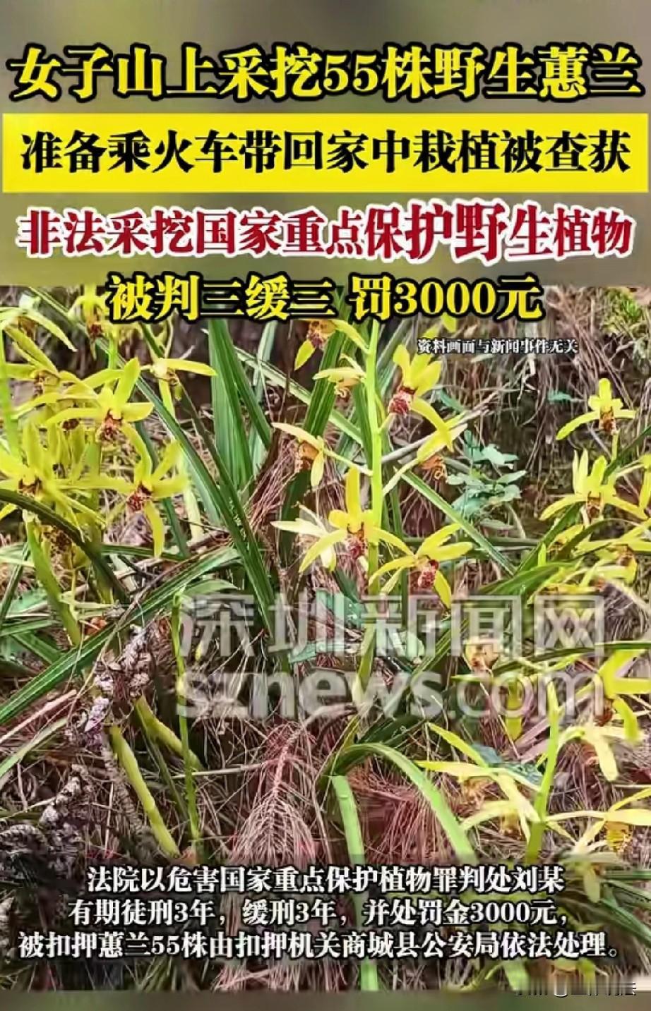 路边的野花别乱采!河南信阳,一女子看山上的兰花长得正好,喜欢的不得了,想都没想,便挖了一堆准备带回老家,种在院子里观赏。谁知,坐火车时被民警当场拦住。经鉴定,她挖的55株兰花都是蕙兰,属于国家二级重点保护野生植物。女子瞬间傻眼,她一个农村妇女什么都不懂,只知道好看,没想到,竟摊上大事了。 女子刘某一直喜欢摆弄花草,听说野生兰花好看,还想着挖几株回家养着赏花。 去年10月10日,她在一处自留山上,看到了长得正好,还开着淡雅花朵的野生兰草,心生喜欢。 于是,没有多想,一口气就挖了55株,开开心心带回县城,准备第二天乘火车带回安徽家中,种在院子里观赏。 10月11日下午五点多,她拎着这些兰草到火车站乘车,谁知道刚进站就被民警拦住了。 民警看着她随身带的草不普通,当场就把人扣下,55株兰草也一并被扣押。 刘某顿时就懵了,自己就挖了几棵花,而且这东西漫山遍野都是,没人稀罕,至于这么兴师动众,上纲上线吗? 随后,警方把兰草送去鉴定。不鉴定不知道,一鉴定可把刘某吓懵了。 这些看着普通的兰草,其实是蕙兰,属于兰科兰属的地生草本植物,已经被列入《国家重点保护野生植物名录》,是国家二级重点保护野生植物。 这下,刘某傻了眼,又悔又怕,自己一个没文化的农村妇女,只知道这花是从小在山上见惯的,以为就是普通的植物,根本没想到,它竟然是还是保护植物。 本来想着回家养花观赏,怎么一转眼就成犯罪了。 到案之后,民警一问,刘某就一五一十把自己采挖兰草的经过都说了,也自愿认罪认罚,承认自己确实是不懂法才犯了错。 法院审理过程中,考虑到她主动坦白事实,认罪认罚态度诚恳,可从轻处理,但非法采挖国家保护野生植物的事实摆在眼前,不可否认。 《刑法》第344条规定:违反国家规定,非法采伐、毁坏珍贵树木或者国家重点保护的其他植物的,或者非法收购、运输、加工、出售珍贵树木或者国家重点保护的其他植物及其制品的,处三年以下有期徒刑、拘役或者管制,并处罚金。 刘某未经许可采挖的55株蕙兰,属于国家二级保护野生植物,已构成危害国家重点保护植物罪 。 其采挖行为违反野生植物保护法规,且数量远超“二级保护植物2株以上即构罪”的标准,具备刑事违法性。 虽主观为观赏而非牟利,但不知法不能免责,客观上已破坏野生植物资源与生态平衡 。 最终,法院以危害国家重点保护植物罪,判处刘某有期徒刑3年,缓刑3年,并处罚金3000元。 被扣押的55株蕙兰,由当地公安机关依法妥善处理。 这事真是让人唏嘘不已,本来是想养个花,结果因为法律意识单薄,反倒把自己送进了法院。 这件事也提醒大家,路边的野花野草,看似普通,很可能就是受保护的植物,挖之前可一定要搞清楚,别因为无知犯了法。