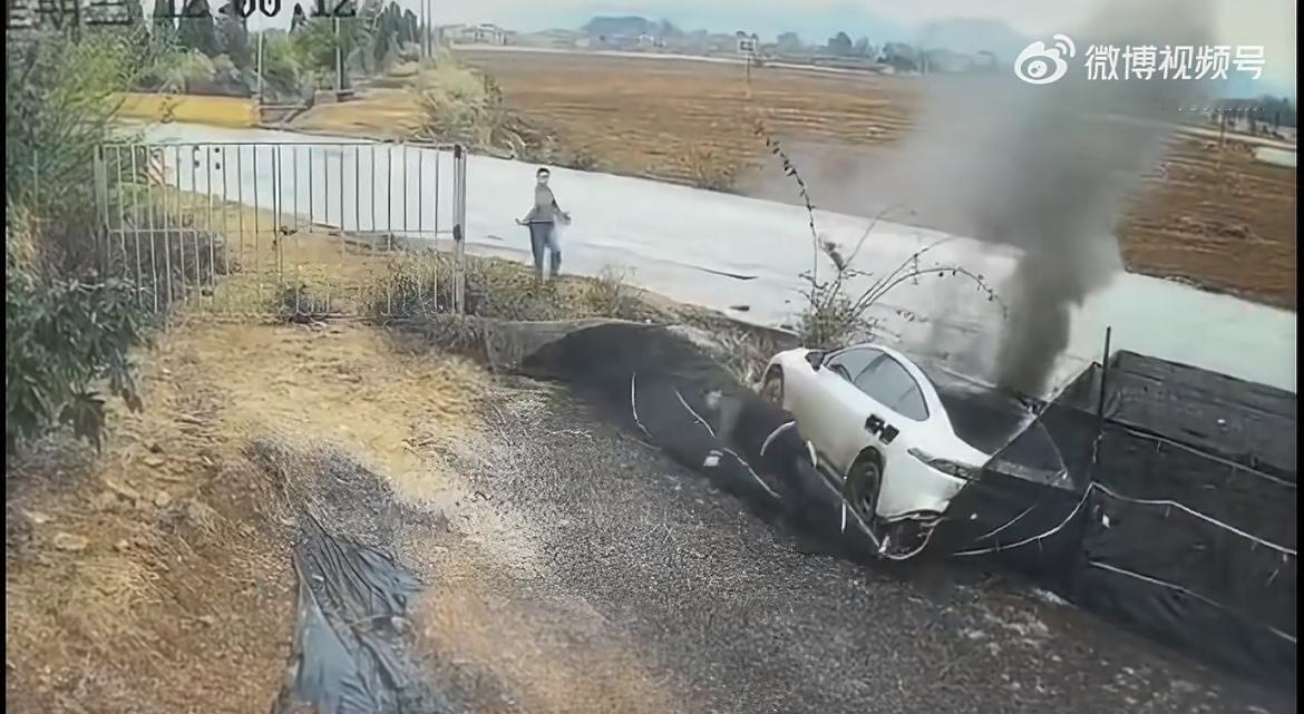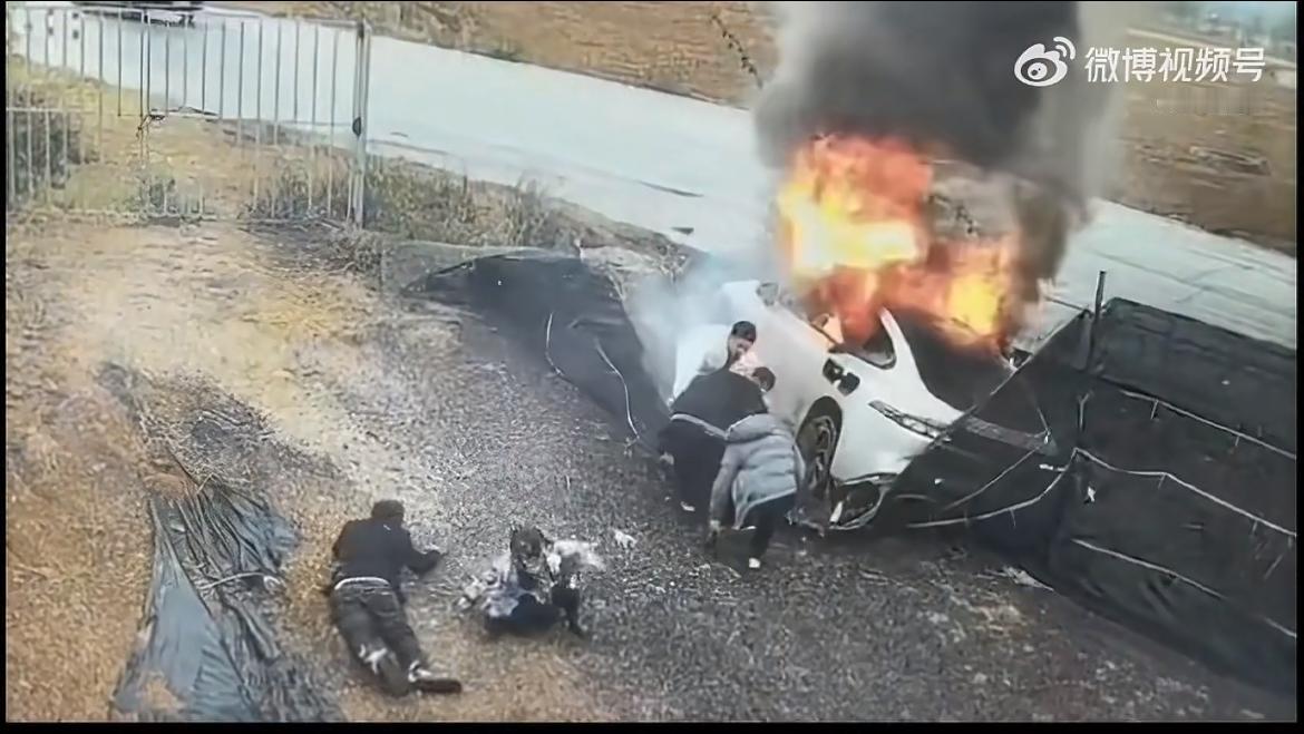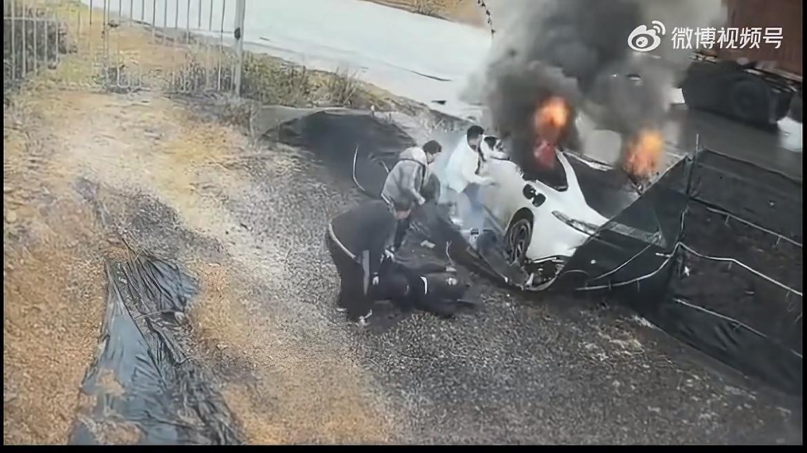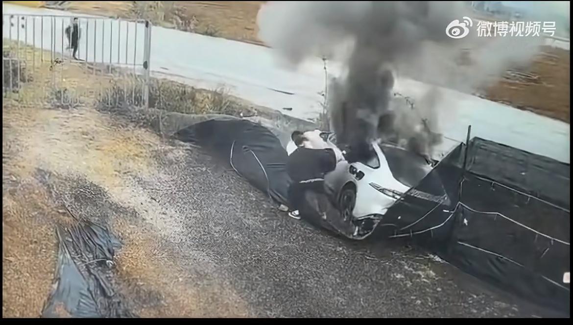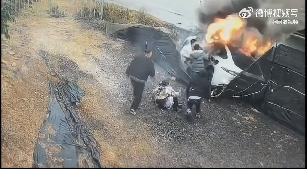 云南某地一电车失控起火,路过白衣小伙徒手勇救3人,太厉害了。某乡村公路上,一辆白色电车突然失控撞向路边的护栏,黑色衣服的自己下车后试图拉开车门,让后排乘客下车,可是车门拉不开,一个白衣小伙冲过来,拿着石头赶紧砸玻璃,车底开始冒烟,小伙不顾安危,陆续把车内3人拖出来。很可惜,副驾驶的人未能救出。小伙已经非常勇敢了,勇气可赞。新能源自燃事故 纯电车起火