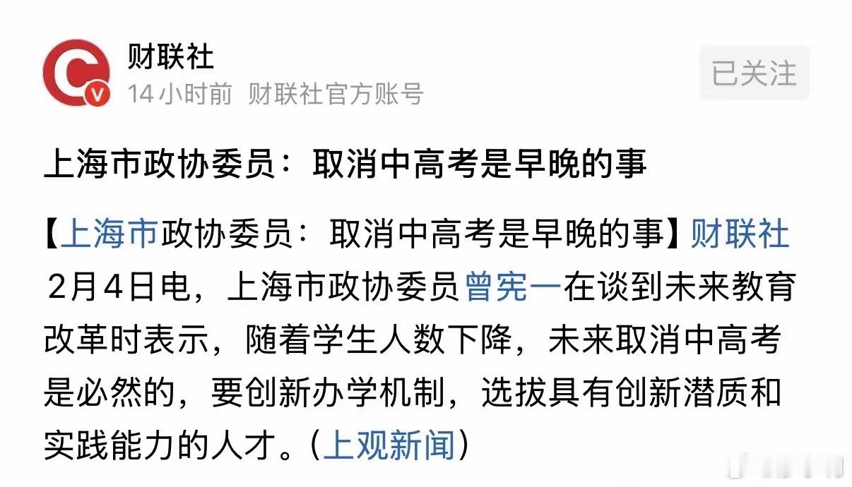 取消中高考是早晚的事现行中高考制度确实有弊端,但我们又不得不承认目前最公平的选拔制度依然是中高考,一旦取消,普通家庭孩子将彻底失去逆袭机会。所以,取消中高考可能是趋势,但短期内至少30年内绝不可能实现。热点观点