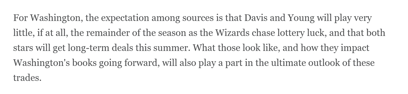 ESPN记者Tim Bontemps:据华盛顿方面的消息人士透露,随着奇才全力冲击乐透签,浓眉和特雷杨在本赛季剩余的比赛里即便登场,出场时间也会极少;而今夏两人都会签下长期合同。这份合同的具体条款,以及其对奇才队未来薪金空间的影响,也将成为衡量这几笔交易最终成效的关键因素。
