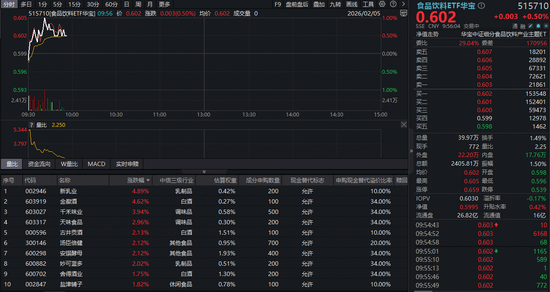吃喝板块今日(2月5日)继续上攻!反映吃喝板块整体走势的食品饮料ETF华宝(515710)开盘后震荡走高,盘中场内价格最高涨1%,截至发稿,逆市涨0.5%。