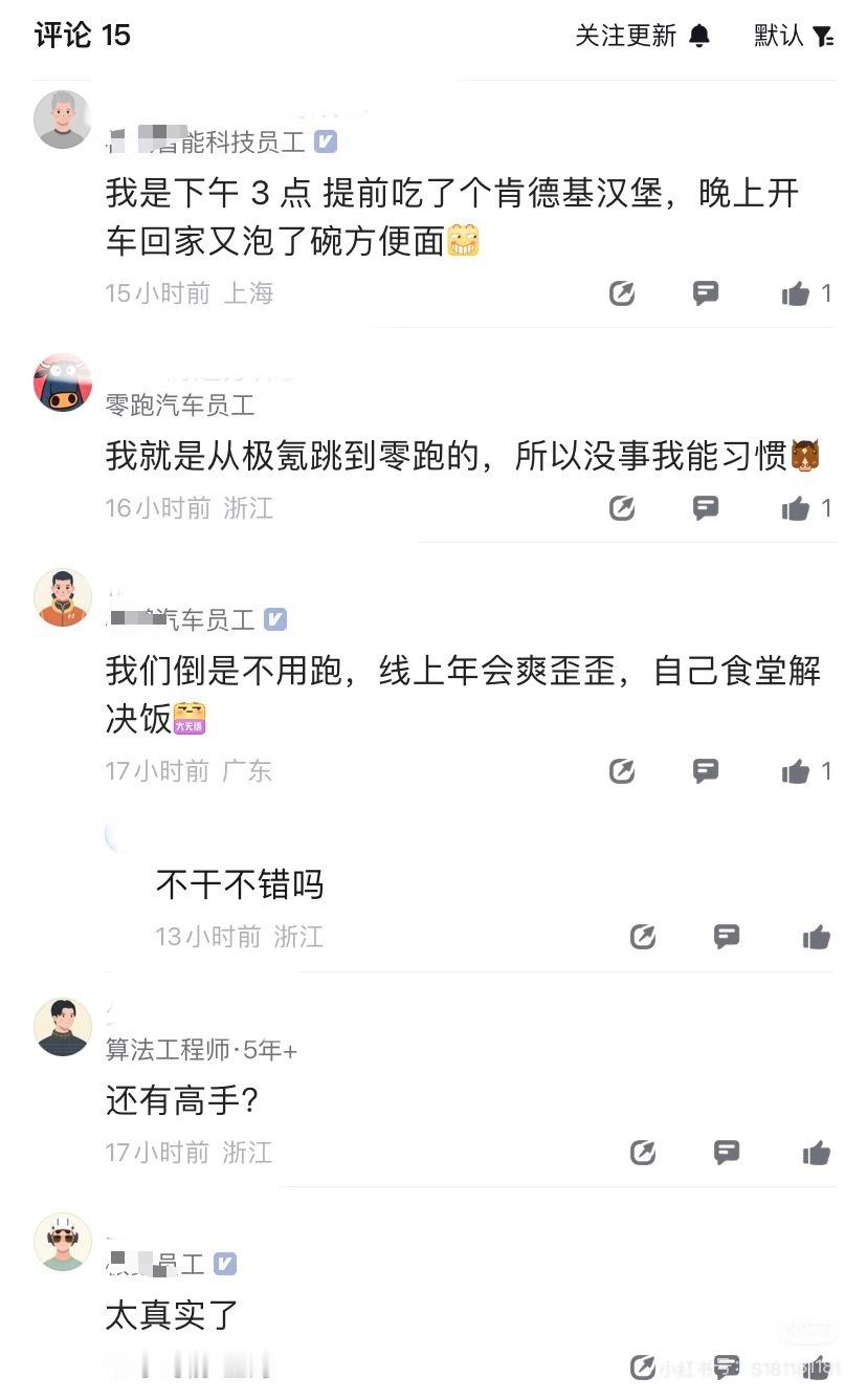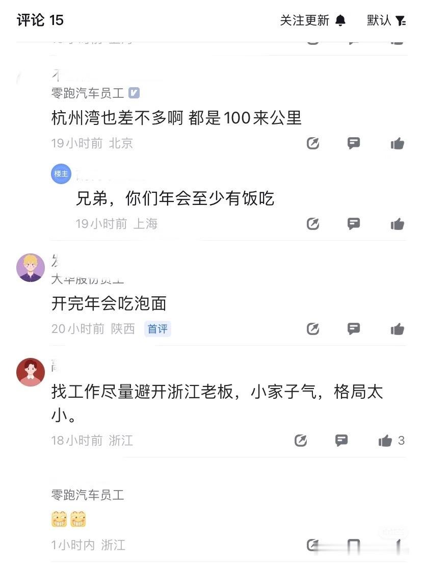 不知道是寒气太重,还是车厂真抠搜,今年新势力车企年会集体翻车?有网友发帖称,对比某车企,零跑的年会已经算是非常豪横了。其他厂的员工又是抱怨吃泡面、肯德基的,又是吐槽线上年会的。还有网友总结评论:“找工作尽量避开浙江老板”。这是认真的??