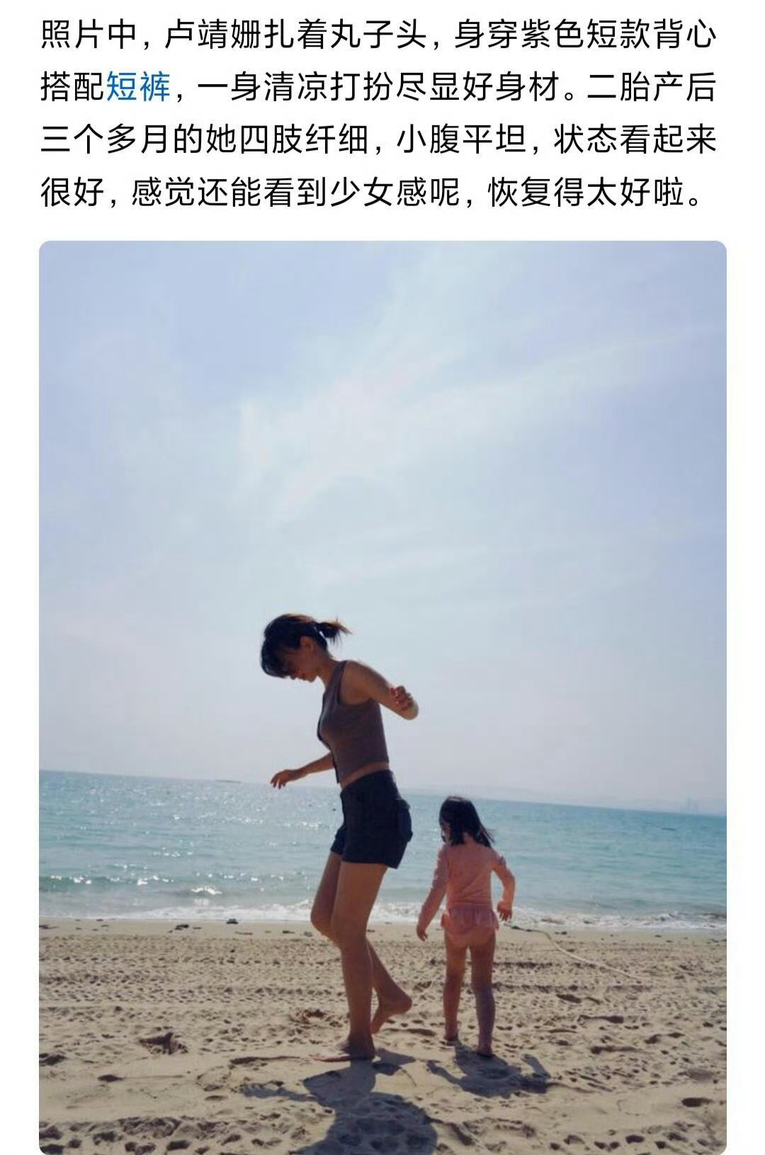 卢靖姗二胎产后3个月状态卢靖姗二胎产后3个月海边晒娃,紫色背心配短裤,四肢纤细小