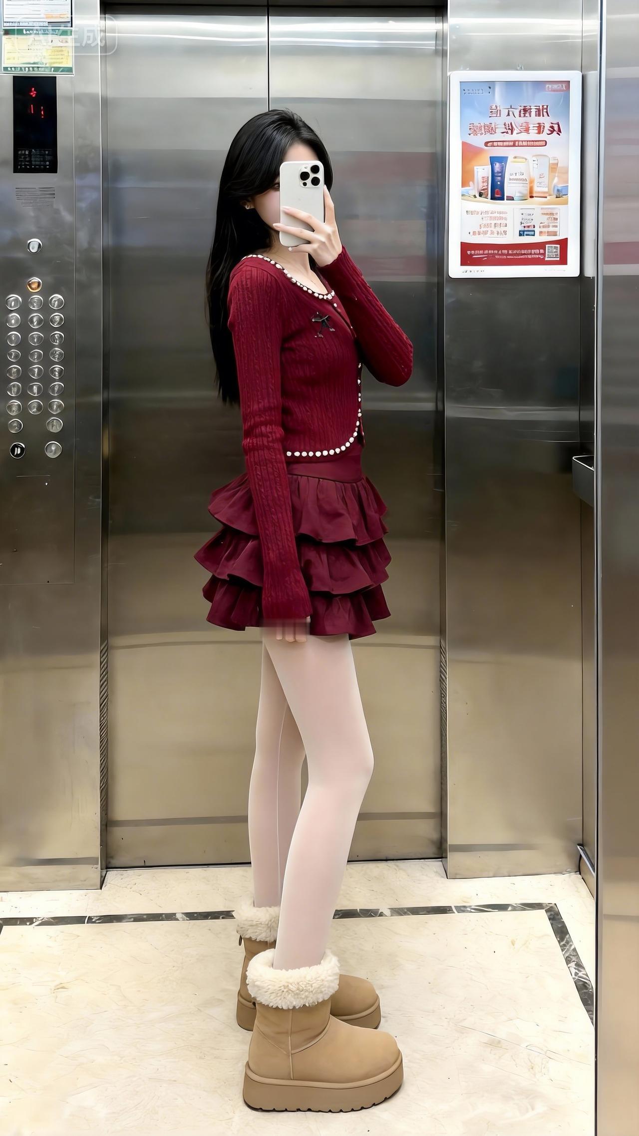 今天穿什么 穿搭 新年穿搭 辣妹出街 电梯拍照
