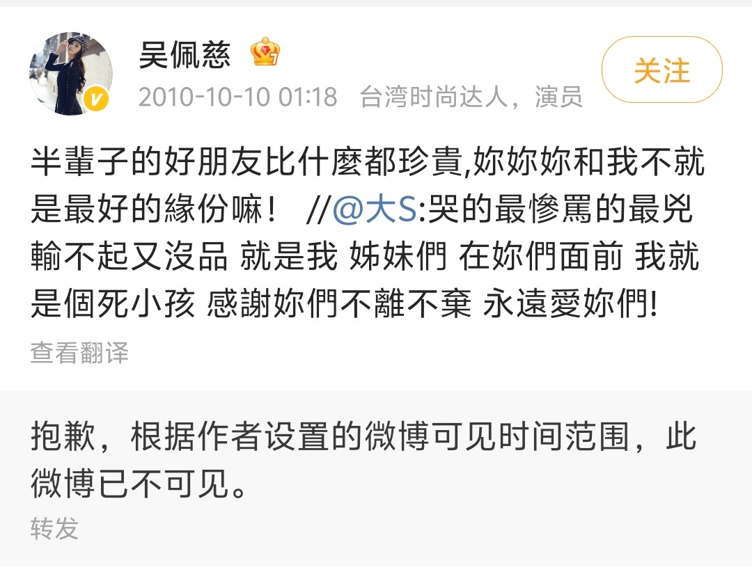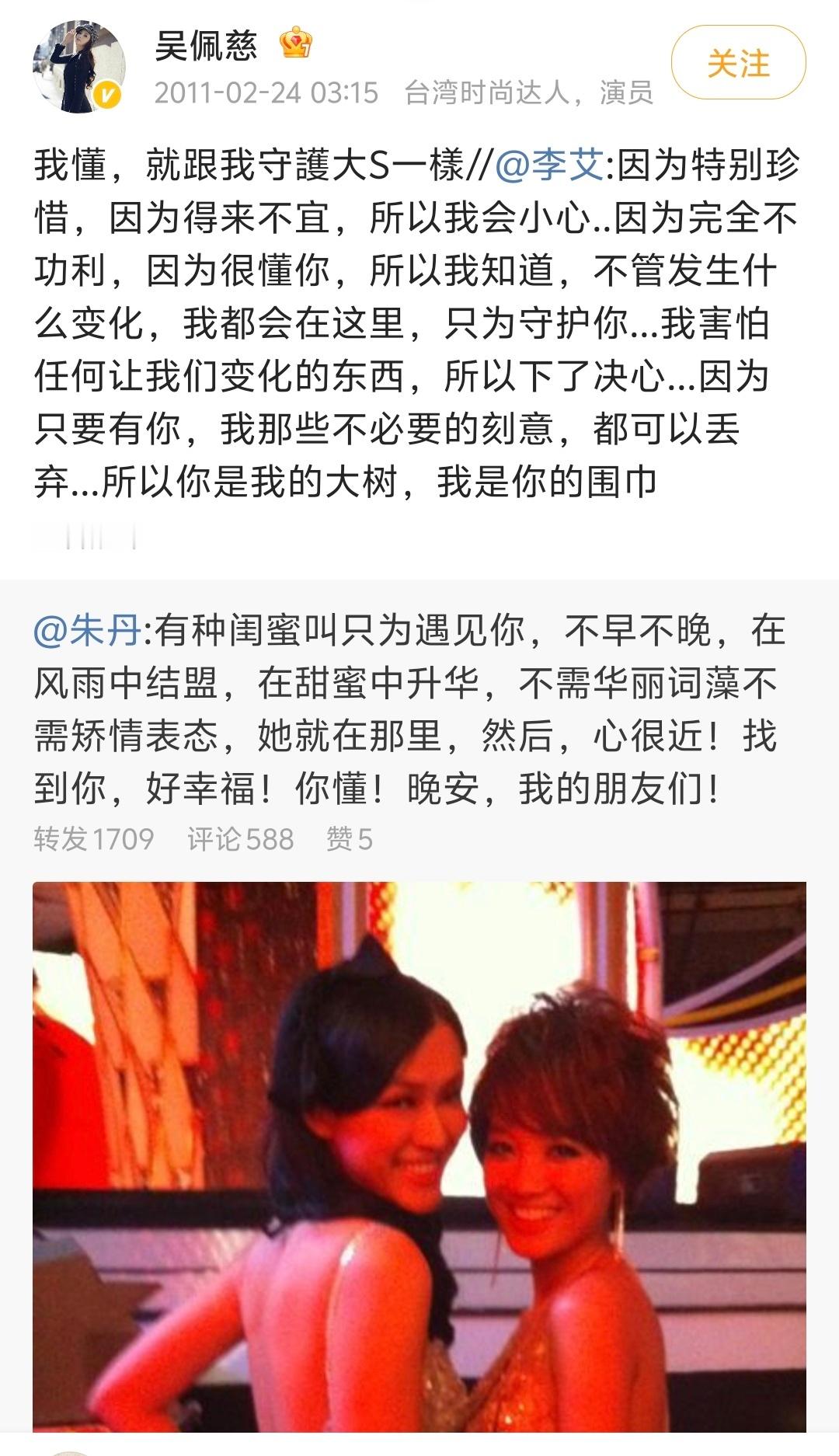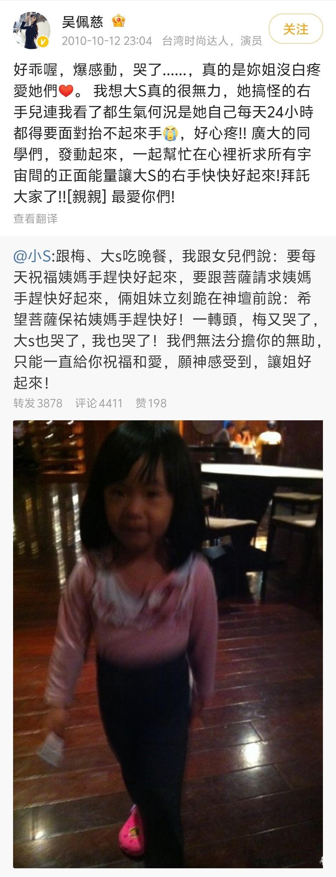 【吴佩慈分享与大S的小故事】大S曾说想和吴佩慈重组家庭 2月4日深夜,分享了一个与大S之间的小故事:大S第一段婚姻开始不快乐之后,曾对吴佩慈提议,等她也不快乐了,两人就重组家庭,大S出去赚钱当爸爸,佩慈留在家里照顾孩子当妈妈。当时吴佩慈还开玩笑地说,“我的姐,你是在唱衰我吗?”后来,这个重组家庭的计划没有实现,大S也找回了毕生的挚爱,吴佩慈说,“可是她让我知道我们可以是彼此的依靠。所以我失去的岂是一个好朋友而已啊!我美丽、善良、可爱、大方、义气的姐,永远爱你!”
