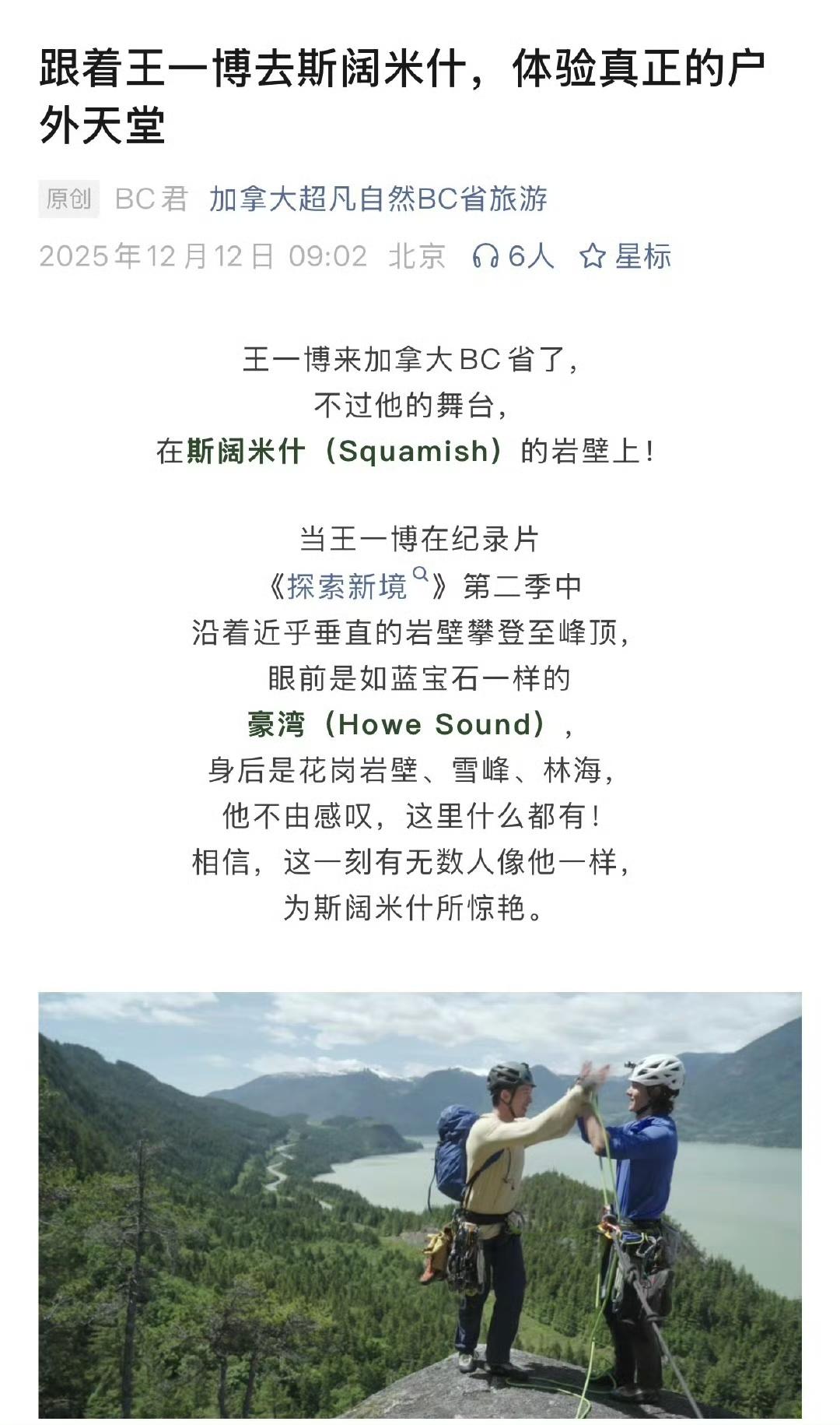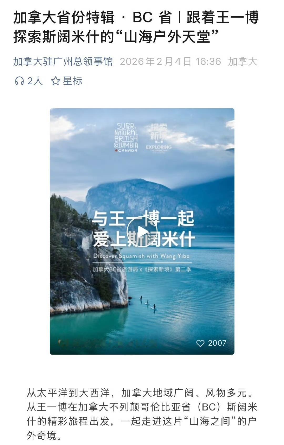 王一博作为发起人的个人ip户外探索纪实纪录片《探索新境》系列的“后劲儿”依然强大[赞]。 “热爱就是发自内心喜欢做的一件事情,甚至可以做一辈子的事情” 加拿大驻广州总领事馆也来推荐王一博的《探索新境2》了[赞]! 王一博,一个热烈自由有着蓬勃向上生命力的灵魂,带给大众的是一部有着强大生命力的纪录片,《探索新境》,探新境,更在“探心境”。 王一博 王一博探索新境