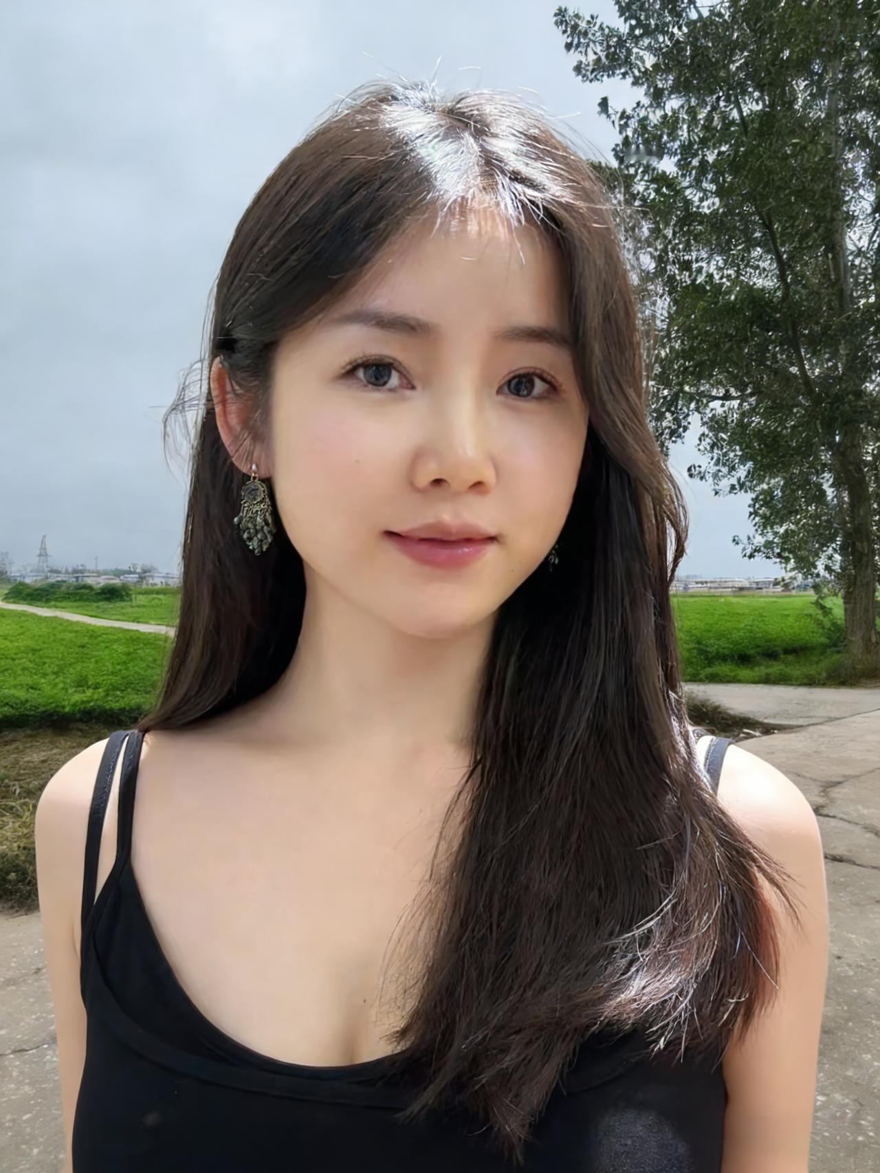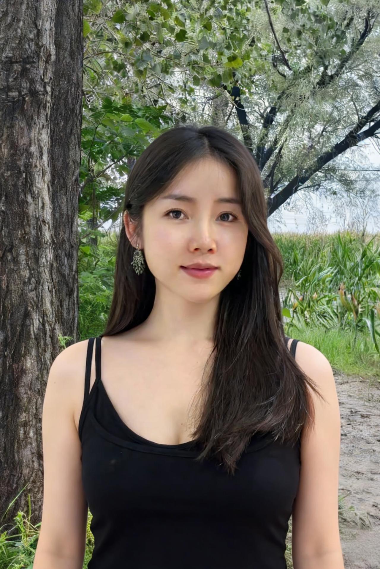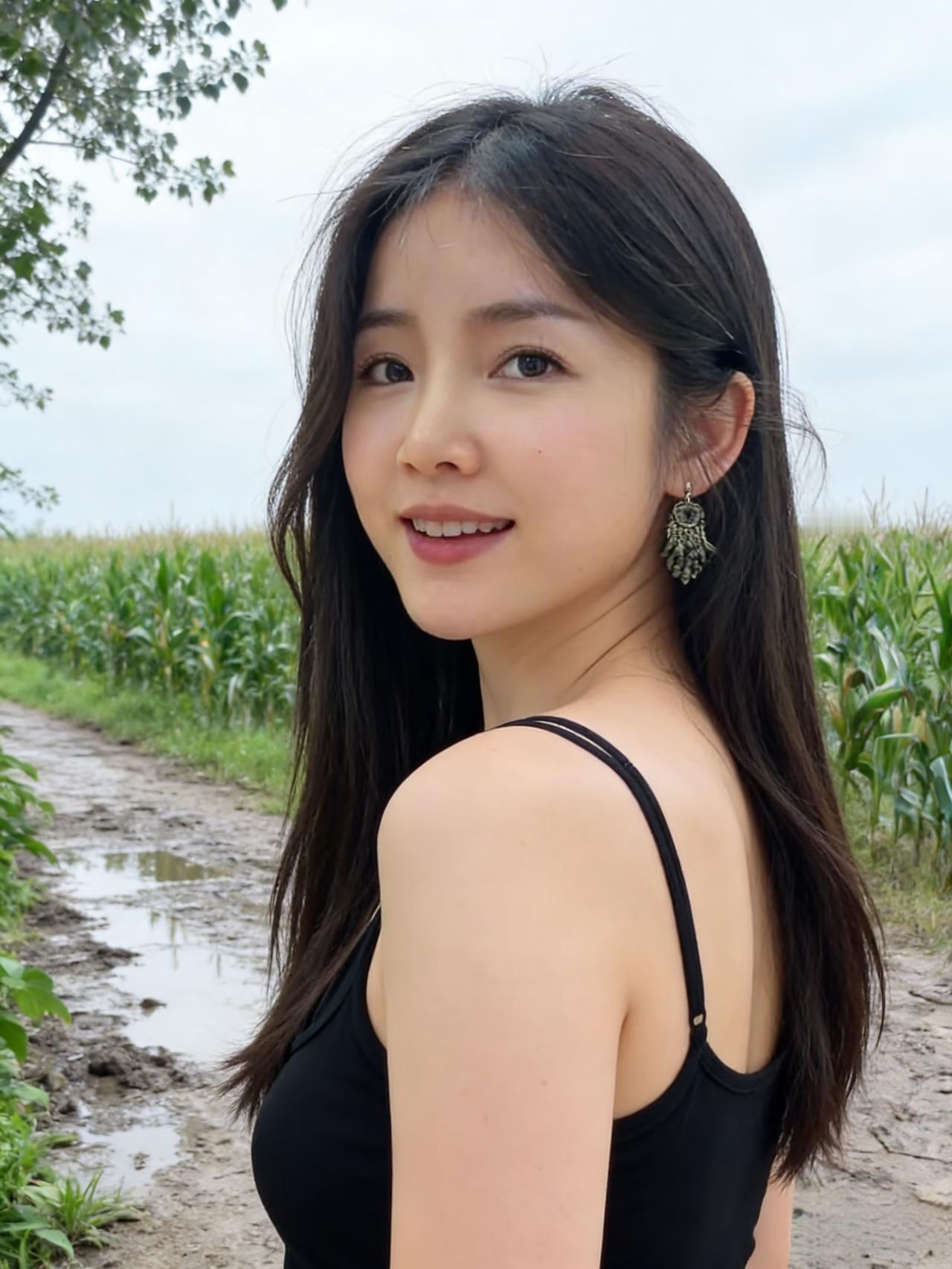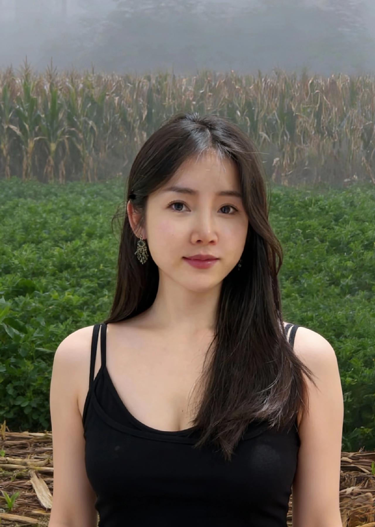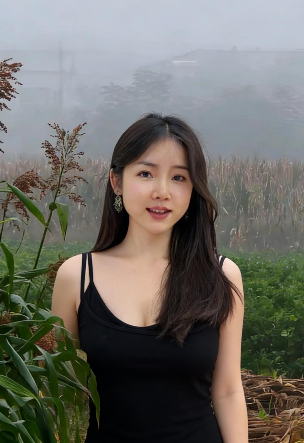 雾把玉米地揉成一片模糊的绿 你站在田埂,像刚从露水里长出的植物 黑色吊带接住清晨的凉意 耳环上的银饰晃着细碎的光 像去年遗落的星子 ~ 风穿过高粱穗,发出沙沙的声响 你的目光比远处的雾更柔软 在湿润的空气里漾开 身后的花生地铺展成绒毯 每一片叶子都在呼吸 ~ 你侧过身时,长发扫过肩颈 弧度比田埂的曲线更温柔 远处的白墙在雾里洇开轮廓 像没写完的句子 而你是最工整的那一行 ~ 泥土的腥气混着青草的甜 你笑起来,雾就散了一些 脚印在湿软的土上印出浅痕 像岁月的邮戳 盖在这个无风的清晨