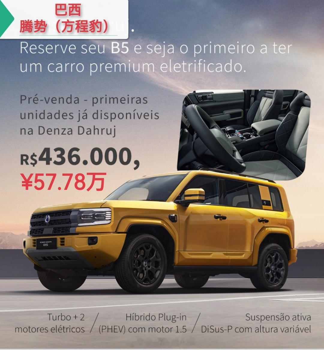 2026年1月,腾势在巴西开启首次交付,当月B5(方程豹豹5)销量130台。