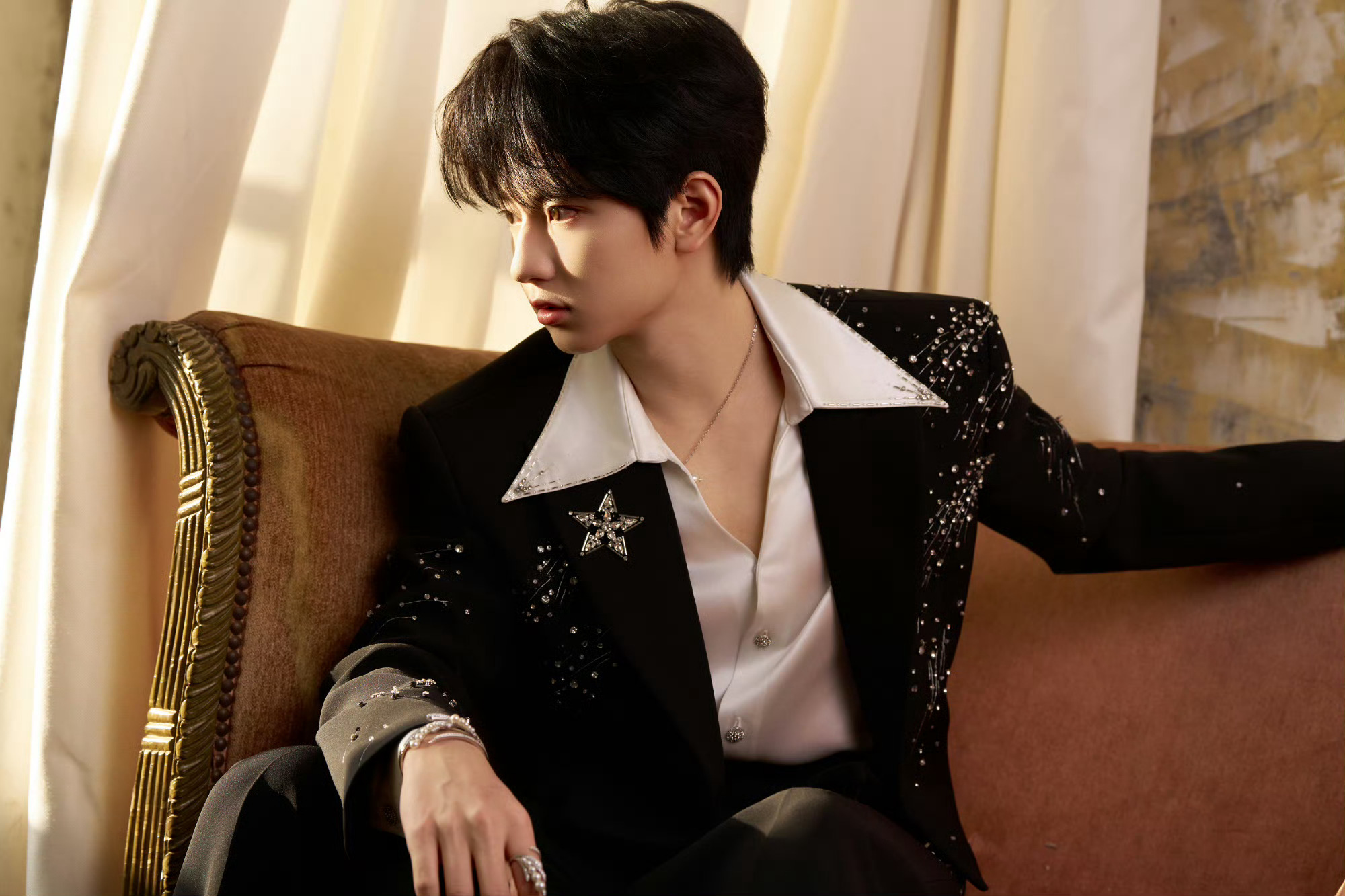 穆祉丞出发时刻 穆祉丞帅气的嘞!碎钻黑西装➕珍珠项链亮晶晶✨穆祉丞碎钻黑西装