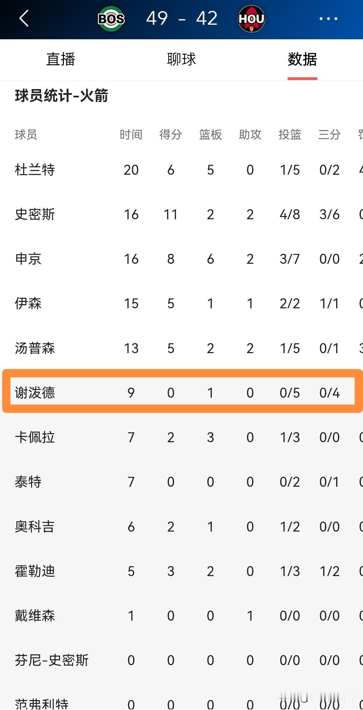 火箭超级新星谢波德真是名副其实的拖油瓶!在今天进行的火箭和凯尔特人的比赛中,目前双方的上半场比赛已经结束,火箭以42:49落后对手7分。在前两节比赛中,谢波德替补出战9分钟,投篮5中0,其中三分球4中0怒砍0分,他的场上正负值为-7。 从谢波德在上半场比赛中的低迷表现来看,他完全就是球队的拖油瓶,他的上场简直是给球队帮倒忙。