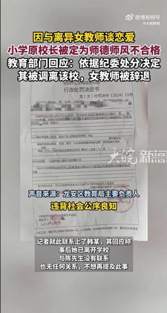 校长与离异女教师恋爱引师德争议 官方与网友各执一词 近日,河南安阳龙安区西高平小学原校长陈先生的遭遇引发热议。据其反映,2023年6月,离异多年的他与同校2022年离异的女教师韩某确立恋爱关系,因顾虑工作未公开 。当年8月,韩某前夫周某窃取手机隐私后,在教育局散发含聊天记录的举报传单,称二人存在不正当关系,随后周某因散布隐私被行政拘留6日 。 事件发酵后,陈先生被调离原校,韩某被辞退。2025年底,陈先生参与岗位晋升时意外发现,自己2024年师德师风考核为“不合格”,晋升受阻。他表示双方属正常恋爱,考核结果未提前告知,对此无法认可。 龙安区教育局回应,陈先生已被纪委给予党内警告处分,其行为违背公序良俗,依据《河南省中小学幼儿园师德师风评价考核办法》直接认定不合格 。 网友对此争议激烈。有网友称:“校长与下属恋爱易涉权力失衡,师德考核不合格合理”;也有网友反驳:“双方均单身,恋爱受法律保护,师德不应捆绑私人生活”;还有网友指出:“核心是是否存在权力滥用,单纯恋爱不该一刀切”。目前当地已启动特殊程序重新调查,晋升工作暂停,事件后续仍待观察。师德争议 教师婚恋 瑞安行拘教师