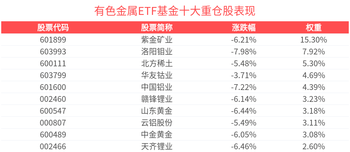 有色金属ETF基金紧密跟踪中证细分有色金属产业主题指数,截至2026年1月30日,中证细分有色金属产业主题指数(000811)前十大权重股分别为紫金矿业、洛阳钼业、北方稀土、中国铝业、华友钴业、中金黄金、山东黄金、兴业银锡、赣锋锂业、赤峰黄金,前十大权重股合计占比51.85%。(以上所列股票仅为指数成份股,无特定推荐之意)