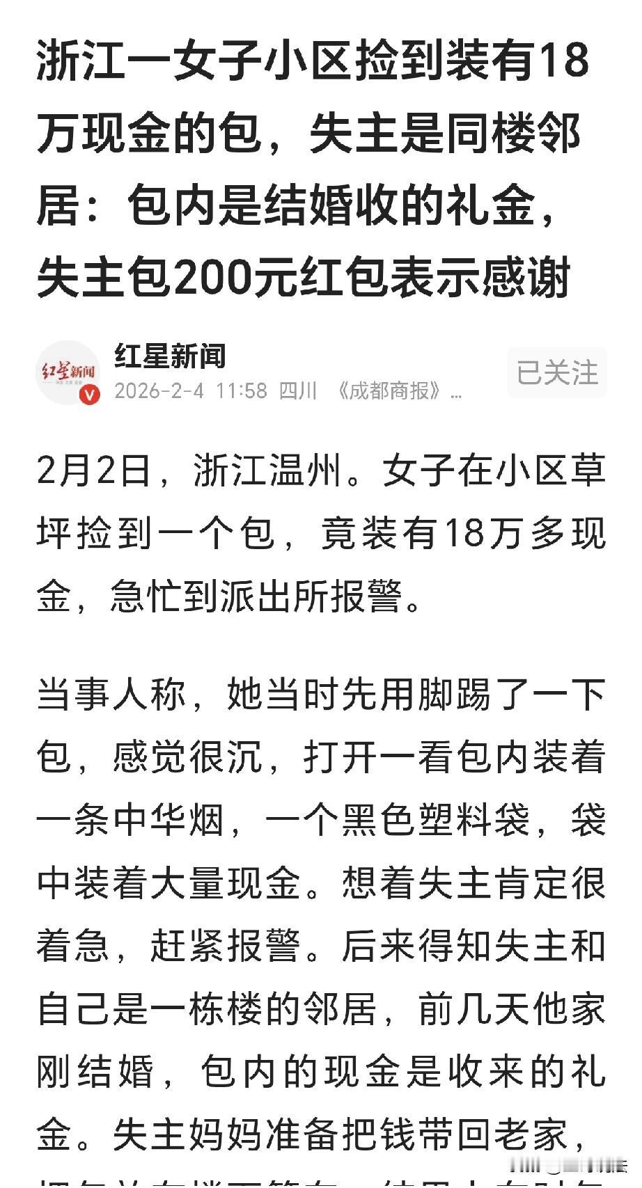 “善举暖人心,这邻居能处!”浙江温州,一女子在小区草坪捡到一个包,她打开一看,包里装有一条华子和18万多的现金,女子报警一查,丢钱的是同一栋楼邻居,他家刚结婚,包里装的是收来的礼金,失主妈妈在楼下等车,上车时包忘了拿了,失主上门感谢,还给她发了200元红包,网友: 抠门儿,对不起那18万现金! 林女士在小区散步,她一路溜达,不经意间瞥见草地上有个包。 这包看着普普通通,可是干干净净,不像是被人丢弃不要的东西。 林女士有些好奇,她看看四周,没有人路过。 她走到跟前,她先用脚踢了一下,怎么感觉包里沉甸甸的。 她心里“咯噔”一下,直觉告诉她这包不简单,肯定里面装着什么。 林女士蹲下身子,小心翼翼地打开了包,只见里面有一条中h烟,还有一个黑色塑料袋。 她慢慢打开塑料袋,顿时惊呆,袋子里满满当当的全是一捆捆的现金。 林女士大概一数,竟然有18万多,林女士急了,这么多钱,失主肯定都要急死! 林女士顾不上多想,拿起包就往派出所跑去,她心里只有一个念头:得尽快把钱交到叔叔手里。 林女士到了派出所里,把经过告诉了民警,民警迅速展开了调查,他们到小区调出了监控。 没过多久,警方就联系上了失主,失主正在家里着急,拍着桌子不知道该咋办好了。 失主听到喜讯,急乎乎赶到派出所里,失主千恩万谢,赶忙询问这位好心人是哪位? 原来,失主和林女士是同一栋楼的邻居,他家前几天刚办了婚礼。 婚礼上宾客满堂,亲朋好友们都来庆贺他们婚姻美满,早生贵子! 随着婚礼结束,失主点了一下收到的礼金,足足有18万多,经过商议,这笔现金要母亲带回老家使用。 谁知母亲收拾好后,把现金用了个黑塑料袋子一包,又拿了一条华子准备回去酬谢父老乡亲。 母亲把烟和现金装进了自己包里,她在楼下等车,结果她年纪大了,上车时一着急,竟然把包给落到了草坪。 当失主得知是林女士捡到了包,并送到派出所时,当时就激动不已,真是缘分啊,原来俩人还是同一幢楼的邻居! 他赶忙上门向林女士表示感谢,还特意给林女士发了一个200元的红包。 林女士反而不好意思了:这都是应该做的,换做谁捡到都会这么做的。 林女士用她的善良和诚实,为我们上演了一幕温暖人心的故事。 她的举动就像冬日里的暖阳,温暖了邻居,也温暖了人心。 有人开玩笑的说,给200元红包有点少嘞,毕竟人家捡到的18万那。 也有人说,不论多少都是心意,你给的太多,人家林女士未必会要,毕竟林女士捡钱时也不是为了要红包的,人家是拾金不昧,就怕失主会着急上火! 有位网友分享了自己朋友的故事: 十年前朋友开出租车,上位一客人去银行取38.8万元,朋友送他到了目的地又去等生意,后来上来另外一个乘客要去城里。 城里在20公里外,到目的地后发现后边有捆钱是8.8万,乘客就和司机说,怎么有捆钱呢? 朋友一想,可能是上个乘客掉的,就打电话给他,那乘客这才发现少一捆钱,叫他们立刻送回去。 朋友心想,送回去这一趟车费他总归会出的,毕竟来回得20公里。 谁知道送到厂门口,上个乘客拿到钱连个谢谢都没说,也没发根香烟给捡钱的那位乘客,人家拿着钱走了,朋友还倒贴了一趟油钱。 因此来说,并不是谁都会感恩的,也有人就会理所应当,认为别人的付出都是应该做的。 也许这200元红包的确不多,就这也是个表示,虽然礼轻,情谊不轻。 毕竟大家都是普通的人,在做着普通的事情,林女士用她的善良和诚实,上演了一幕温暖人心的故事,她暖了别人,也暖了自己。 对此,你怎么看?