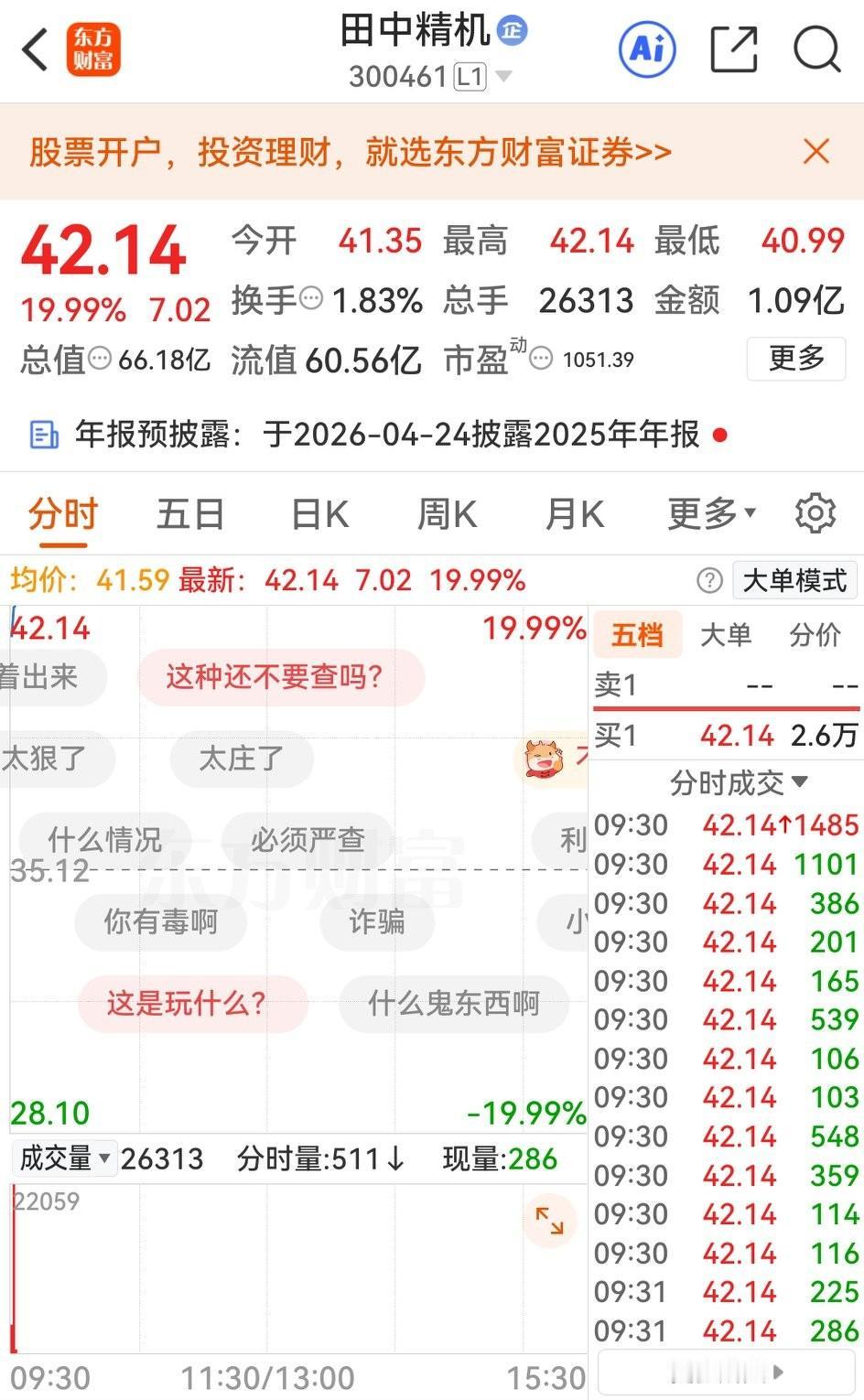 牛逼,田中精机! 田中精机昨日收盘集合竞价最后一刻,一笔78万股的大单精准打击,将该股从涨10%打至跌11%,秒杀逾20cm;但今天开盘就秒拉涨停,涨幅20cm,令人拍案惊奇。 很明显,昨天这笔交易有鬼,疑似老鼠仓作祟,不知监管层是否注意呢?