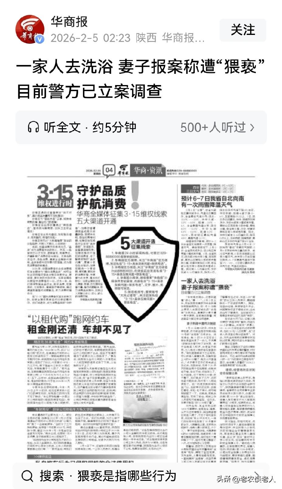 女子洗浴遭陌生男子猥亵,警方立案! 在我国北方地区,冬季由于天气寒冷,冰封雪地,气温极低,在家里洗澡,十分寒冷。因此人们习惯到澡堂或者洗澡店里去洗澡,比在家里洗澡要暖和得多,舒服得多。所以,冬季北方人去公共澡堂洗澡已经成为一种习惯。 据媒体2月4日报道,家住陕西安康的一男子,于1月31日晚上,带家人去西安城北的一家公共汤泉洗浴,因该澡堂顾客过多,只好在澡堂过夜。到清晨时分,妻子在电玩室里休息熟睡时,竟遭一男子两次触碰,进行猥亵,被丈夫发现后,立即报警,警方已立案调查中。 在此提醒大家,冬季去澡堂洗澡的时候,一定要做好自己的自我人身隐私和安全保护,因为公共澡堂人多人杂,形形色色各种各样的人,鱼龙混珠,有一些不法分子,道德观念低下,会借此机会偷看、偷拍和猥亵等违法犯罪行为,是时有发生的,因此,大家千万要做好自我隐私保护,避免自己的隐私权利被人家侵犯。一旦自己的合法权利被人侵犯以后,要立即报警,一定要立即采取法律手段维护自己的合法权利。 以上是本人观点,如有不妥,请大家在留言区中留下你宝贵的意见,并积极参与评论,特邀请大家关注怎样保护自己的人身合法权益。 我的年度菱感记忆女子洗浴遭陌生男子猥亵 警方立案