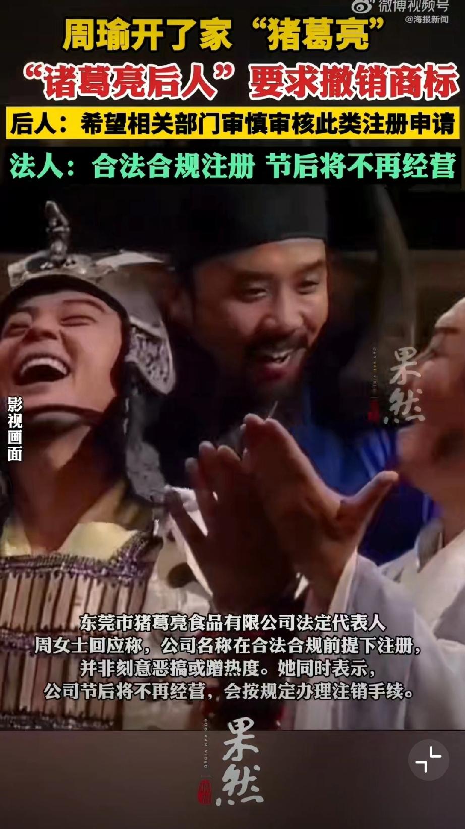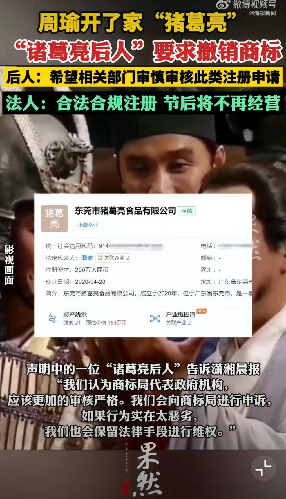 诸葛亮后人要求撤销猪葛亮商标。刚想说一句,有后人就是好!一看法人…呃,你说法人叫什么?周瑜…😂 另外,从法律层面,“猪葛亮”商标其实不该注册成功,因为违法商标法。 诸葛亮是知名度很高的历史先贤,“猪葛亮”谐音恶搞、贬损先贤,是违背公序良俗,违反《商标法》第10条,不知道当初注册时为何放行了?周瑜文化 诸葛亮灯笼 成都葛亮