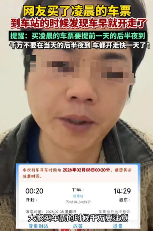 “笑不活了!”一男子准备回老家过年,买车票时买了一张凌晨的票,结果等他去车站时才发现车早就走了,他看了一下自己车票的上车时间,反应过来后气得锤了自己一拳!网友:肯定还有人遇到过这种事! 春运的车站永远裹着归心似箭的热闹,也藏着不少让人哭笑不得的乌龙,最近一位大哥的经历直接在社交平台火了,满心欢喜抢了回老家的凌晨车票,结果揣着票赶到车站时,才发现车早就开走了。 每年春运,抢票都是打工人的头等大事,尤其是热门的返乡线路,白天的车票基本刚放出来就被一抢而空,很多人为了能回家,只能退而求其次蹲守凌晨的车次,这位大哥也是如此。 为了赶上过年和家人团聚,他连着好几天定闹钟蹲守 12306,眼瞅着屏幕上跳出一张凌晨的车票,想都没想就赶紧下单。 抢到票的那一刻,他只觉得松了一口气,匆匆看了眼票面的时间就关掉了页面,压根没仔细琢磨凌晨车次背后的时间门道,收拾行李时还美滋滋想着,等出发当天提前点去车站就行,完全没意识到自己已经踩了个隐形的坑。 等到他算好的 “出发日”,大哥背着塞得满满当当的行李,拎着给家人带的年货,赶在后半夜到了车站,想着离发车时间还有段时间,还慢悠悠地去自助机取了票。 可走到检票口的时候,他却傻了眼,原本该显示自己车次信息的屏幕一片空白,检票口前更是空荡荡的,连个同车次的旅客都看不到。 他心里犯起了嘀咕,还以为是车站的系统出了故障,赶紧跑到值班窗口问工作人员,结果工作人员接过他的车票扫了一眼,一句话就让他瞬间僵在原地:“小伙子,你这趟车是昨天凌晨的,早就开走快一天了。” 大哥赶紧把车票凑到眼前反复核对,票面的发车日期和时间清晰地印在上面,那一刻他才反应过来,自己一直以为的 “当天凌晨”,其实是前一天的后半夜。 而他赶过来的这个时间,早就错过了发车时间。满心的期待瞬间落空,还有一丝哭笑不得的懊恼,而他站在检票口前手足无措的样子,也被同行的朋友拍下来发到了网上,很快就引来了大批网友的关注。 其实春运期间,像这位大哥这样看错凌晨车票时间的人,真的不在少数,有网友为了赶凌晨的车次,特意提前两个小时到车站候车,结果蹲了半天才发现,自己的车票是前一天的,不仅白等了一场,退票还被扣了手续费。 之所以大家总在凌晨车票上栽跟头,说到底还是没摸透铁路系统的时间逻辑,铁路部门实行的是 24 小时运营制,车票上的时间都是 24 小时制。 而凌晨 00:00 到 06:00 的车次,虽然票面标注的是当天的日期,但实际是前一天深夜的延续,想要赶上这趟车,必须在前一天的后半夜就赶到车站候车,而不是大家直觉里的 “当天凌晨”。 再加上春运期间车站的客流量大,各个车站还会根据实际情况提前停止检票,有的车站开车前 5 分钟就会关闭检票口,凌晨的车次乘客相对较少,检票流程结束得也更快,一旦错过,基本就没赶上的可能了。 这则视频发到网上后,评论区直接成了网友们的 “翻车经历分享会”,有人说自己去年也是这样,错过凌晨车票后在车站的候车厅蹲了一夜,最后只能重新抢票。 有人分享自己的经验,说现在只要买凌晨的车票,都会在日历上特意标好前一天的候车时间,还会定上三四个闹钟提醒自己。 今年春运,铁路部门其实也考虑到了大家容易买错票、看错时间的情况,推出了不少便民措施,但即便有这些保障,出门前核对车票信息还是必不可少的事。 春运路上,每一次奔赴都是对家人的思念,而这些因为粗心闹出的乌龙,也成了春运里别样的小插曲。 回家的心情再迫切,也别忘了多一份细心,看清车票上的每一个信息,毕竟只有顺利赶上列车,才能开开心心地和家人团聚。 对于这件事,您有什么想说的吗?欢迎评论区留言讨论。 信源:宁波晚报2026-02-04——《网友将凌晨的高铁当成晚上坐,到站后发现车早就开走了,提醒:买0点以后车票的人日期要往前推……》